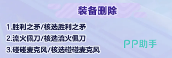 然后是被删掉的装备,这次一共删了三组:胜利之矛、流火佩刀、碰碰麦克风,连带核选版本一起下架了。如果之前有在用这几件装备的玩家,记得重新调整一下配置,不然上场可能会出问题。