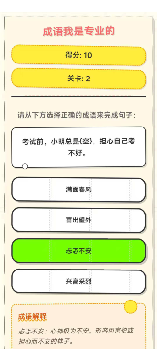 填空猜词研成语,详解用例助理解,大家从下方备选成语中挑选合适的填入括号,答对题目就能通关,解锁后续关卡,成语种类齐全完备,难度阶梯由浅入深、循序渐进。每个成语都配有详尽释义与经典用例,帮你轻松理解含义、掌握用法,帮助玩家深化理解,还有错题收集功能,方便后续复盘巩固,它点击选择答案即可,每局时长短,轻玩高效长本领,在积累中提升语言素养。