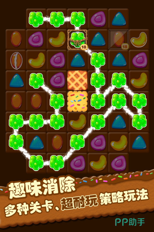 画面采用高饱和度糖果配色,建模细腻,视觉氛围轻松愉悦。核心玩法为滑动连接三个或以上同类型糖果形成直线,触发消除。不同糖果具备差异化特效机制,策略组合丰富;任务目标明确,收集指定糖果即可推进关卡,上手无压力,节奏明快。