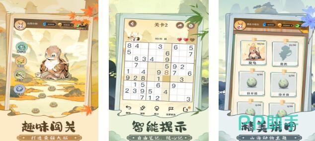 本作严格遵循经典数独规则:9×9标准宫格,每行、每列及每个3×3子区域均须填入1–9不重复数字。逻辑容错空间小,一次误填常需全局复盘,但成功完成后的满足感极为强烈。游戏内置多套主题皮肤,通关后可累积积分,用于解锁以《山海经》为灵感原创设计的图鉴内容。