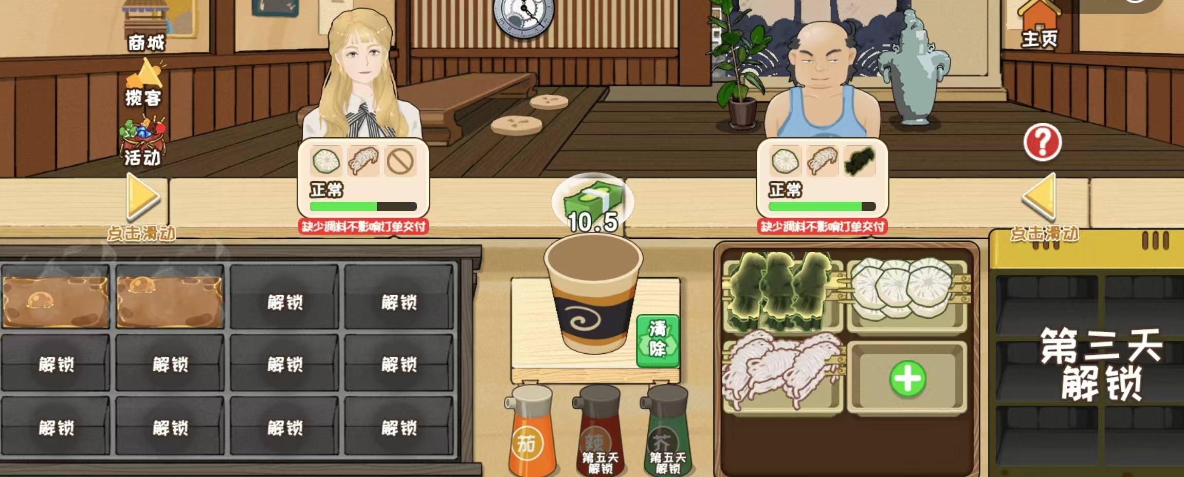 游戏以经典日式关东煮为切入点,玩家扮演一家街角小店的经营者。初期资源紧张,煮锅格子数量有限,需在倒计时内精准完成顾客订单——加入蘑菇、土豆、莲藕等常见食材,熬煮出香气四溢的汤底。老主顾频繁光临,高效出餐还能额外获得小费奖励,助力店铺逐步升级设备与菜单。