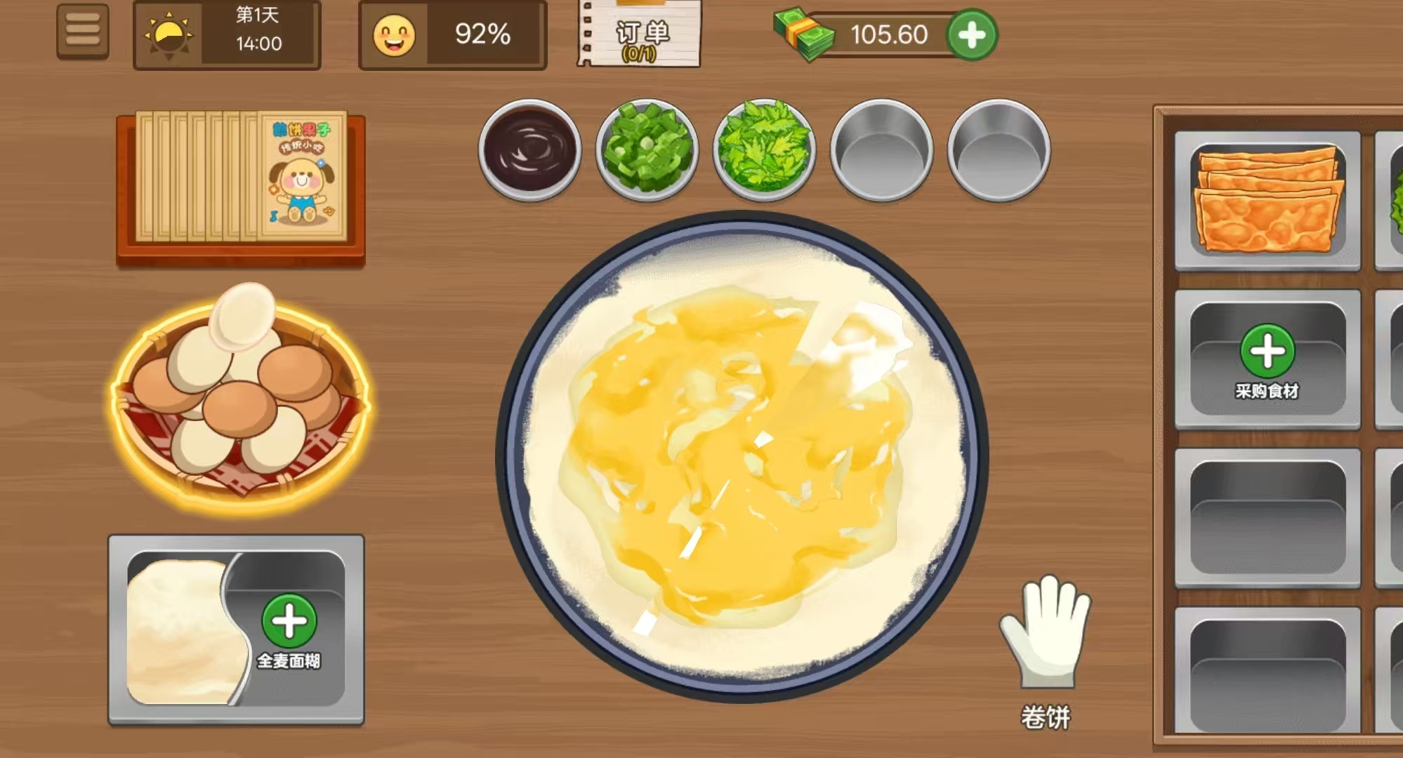 以中式煎饼摊为原型,强调“摊制”核心动作。玩家需控制面糊倾倒量与锅体旋转节奏,确保饼体圆整均匀;随后淋蛋、摊开、撒料——葱花、辣酱、薄脆等配料自由搭配,直接影响顾客满意度与复购率。操作手感细腻,成长路径清晰,还原了校园周边小吃摊的真实烟火气。