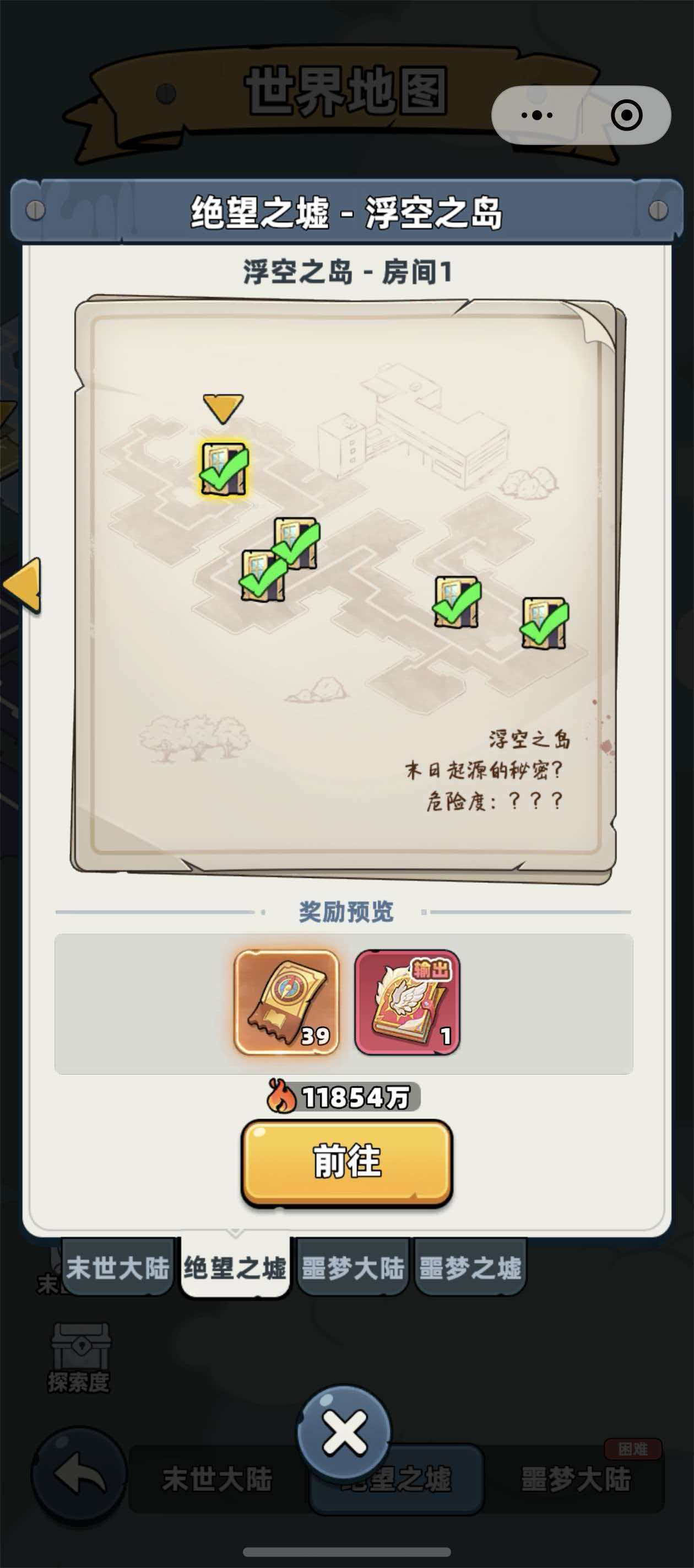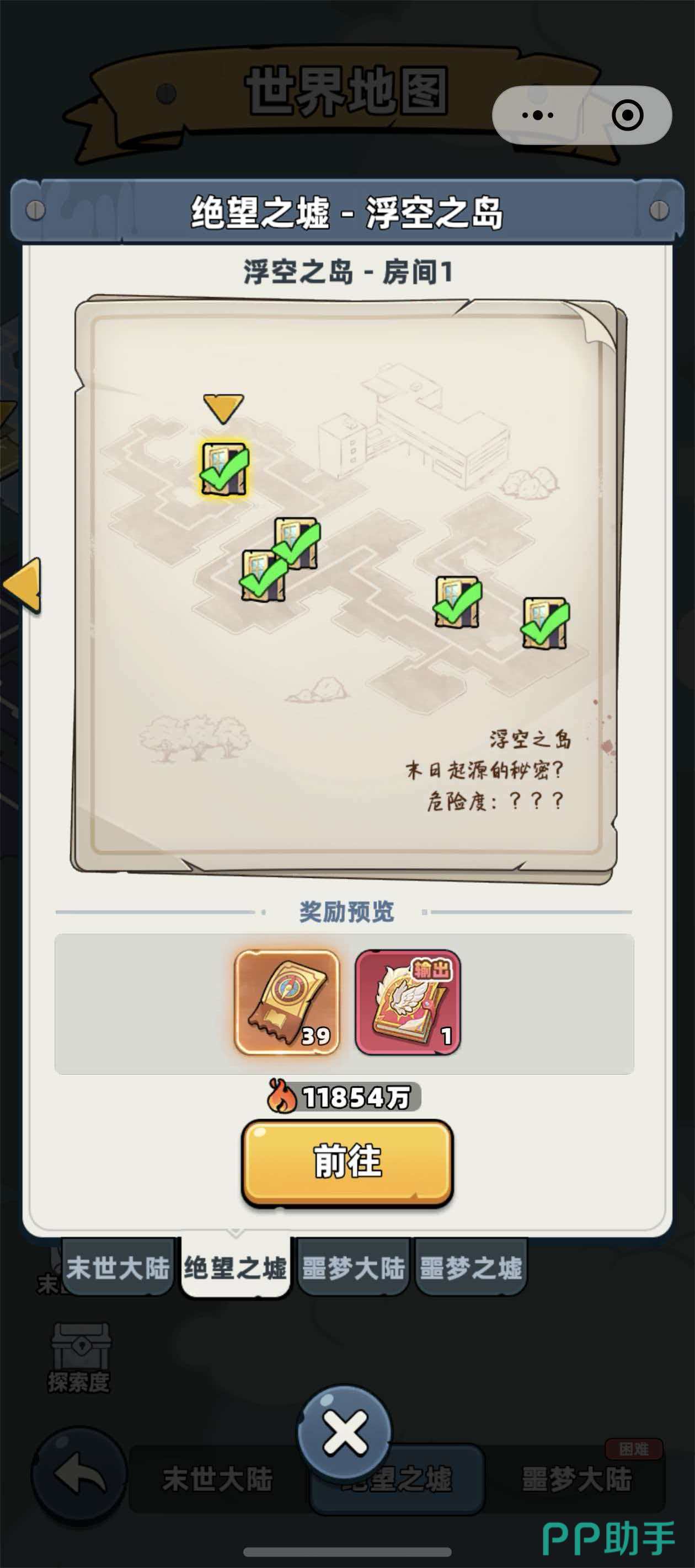 在浮空之岛这张地图上除了需要玩家打boss以外,还需要玩家去各个房间中进行探索,每一个房间在探索时都会有着相对应的战斗力要求,玩家一定不要忽略战斗力要求的设定,若是战斗力不足的话,是很难成功探索的,只要完成房间探索,玩家就可以获得大量的奖励,这里需要大家注意的是有些房间,大家可以在世界地图上看到,可在浮空之岛的地图中却看不到,这时玩家就需要携带灵异照相机这个技能书了,有了这个技能书才能看到隐藏起来的房间。