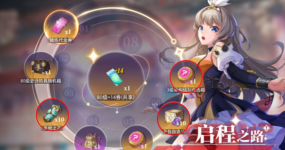 除了装备,80级之后还有史诗合铸装备自选、圣物之芯、卡包自选、三级异构铭刻自选箱,还有加14强化券和团本增益buff。这些东西凑在一起,基本上进团战的门槛就够了,不会一进去就被队友嫌弃。另外连续登录满8天,还有额外的礼包可以领,每天记得上线签个到。