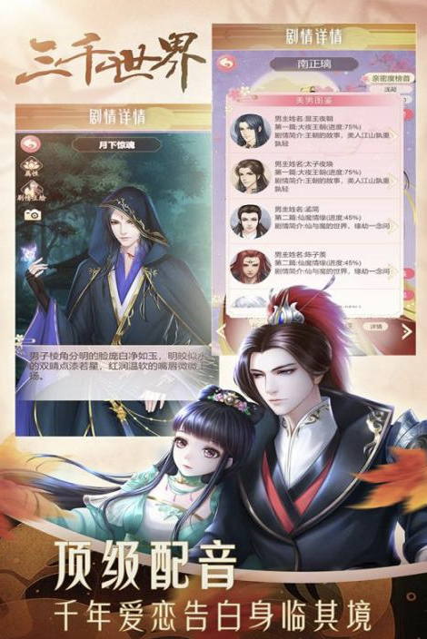 接近一万件古风装饰,从汉代到民国全部涵盖,任何场景都能实现合理搭配。服饰没有固定搭配对象,甚至可以跨性别体验,完全让玩家主导审美权。包含大量免费小说剧情,更有专业人士配音,每次阅读时都有满满的代入感。玩家能跟各种主角约会,用来提升好感度,发展更多恋爱剧情。