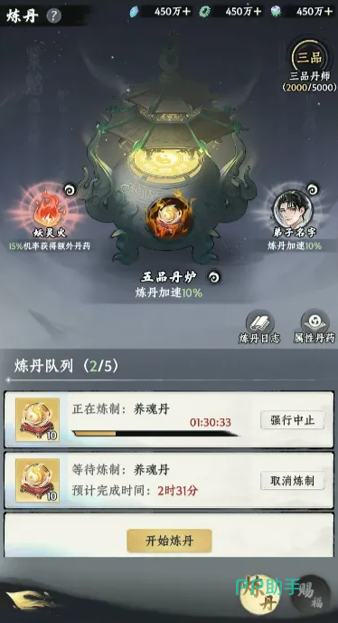 有了它我们就可以进入炼丹界面,炼丹选择自己想要的丹药投入相应材料即可,通过“炼制队列”功能,最多可同时安排五个炼制任务,实现连续自动炼制,大家可以一次性安排好后续的炼制计划,大幅减少频繁上线的负担,更加从容地享受离线修炼的乐趣。
