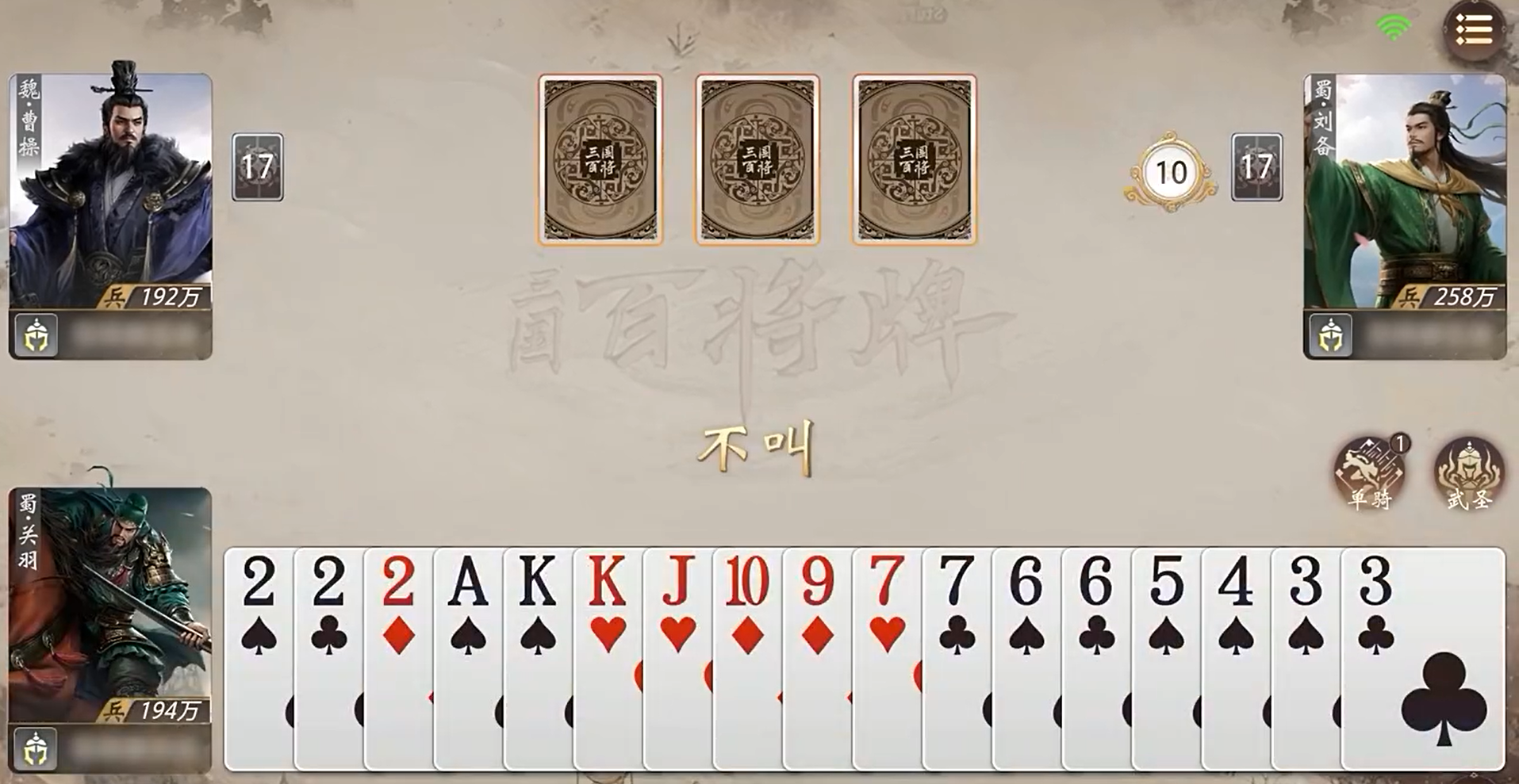 这款以三国时代为背景的卡牌策略游戏,玩法简单容易上手,以斗地主的模式为基底,分为农民和地主两大阵营,而出牌的角色加入了三国杀中武将技能的设计,给游玩者带来耳目一新的玩法体验。玩家出牌时,不仅要考虑扑克牌本身点数和花色的牌组搭配,考虑自方所处阵营,还要结合出牌角色所属的武将的技能进行施放,使得游戏可玩性大大提升。