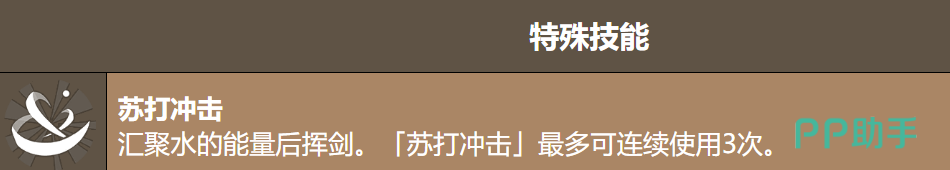 特殊技能「苏打冲击」是奶油苏打饼干的主要输出手段之一。这个技能可以连续使用三次,每次都是汇聚水的能量然后挥剑。三连之后伤害叠加起来还是很可观的。而且用完之后被动就会触发,基本攻击进入强化状态,这时候接上三连基本攻击,叠层效率非常高。