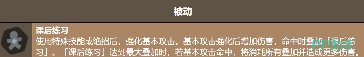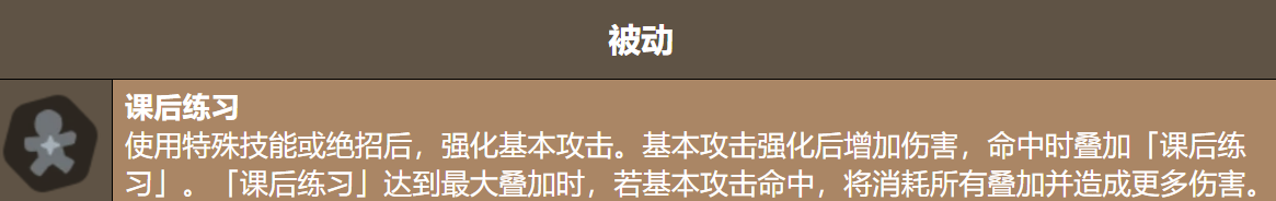 先说被动技能「课后练习」。这个被动是整个角色的核心,理解了这个才算真正懂奶油苏打饼干。简单来说,每次用完特殊技能或者绝招之后,基本攻击就会进入强化状态。强化之后的基本攻击打出去会叠加「课后练习」层数,叠满之后再打一下,就会把所有层数一次性消耗掉,造成一大波伤害。这个机制听起来不复杂,但实际操作的时候要注意节奏,不然叠层叠到一半就浪费了。