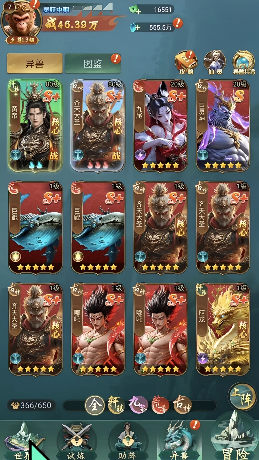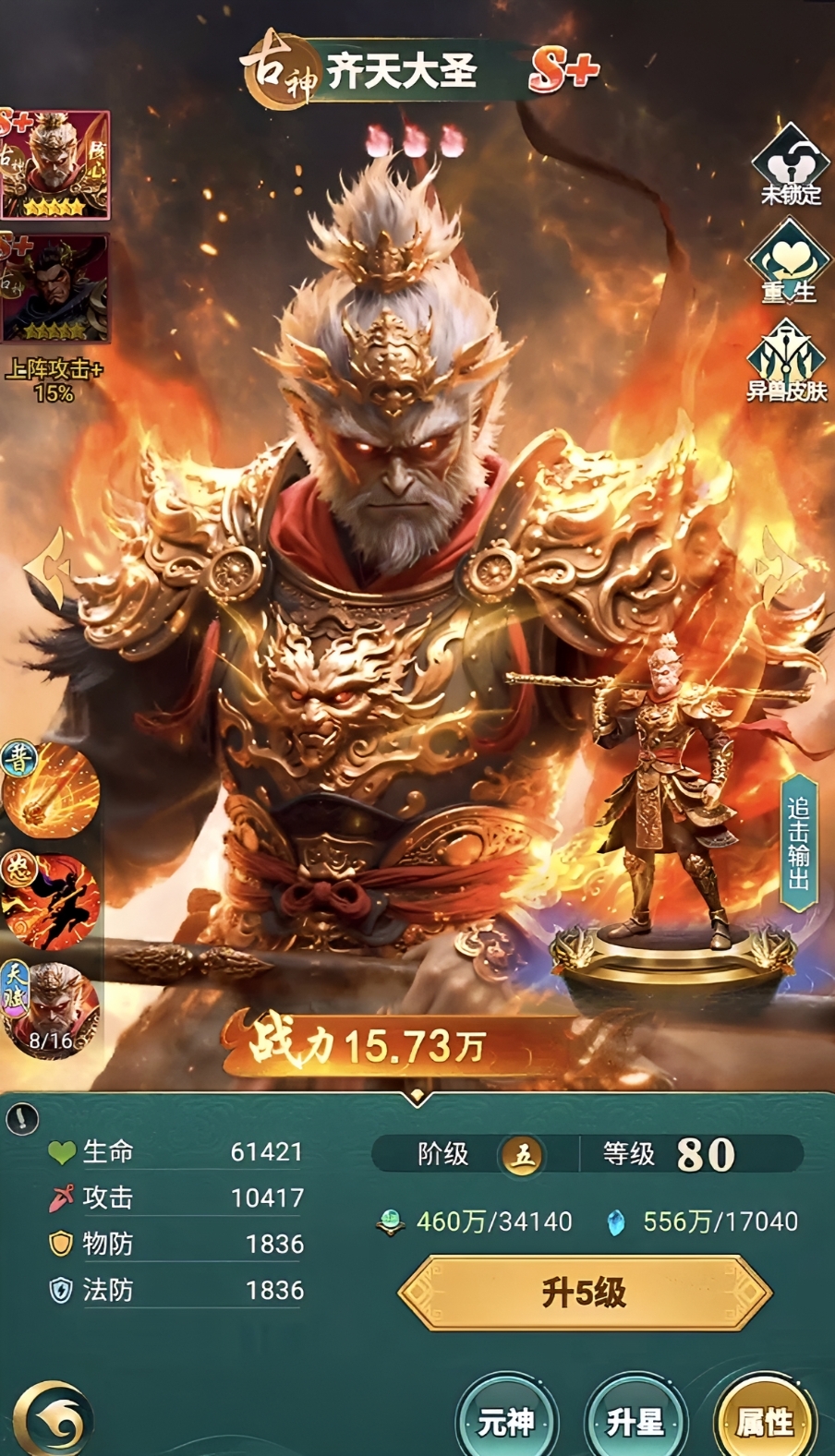 当玩家熟悉了基本思路以后,接下来要为玩家们介绍几位比较突出的异兽英雄角色,第1个是古神阵营的齐天大圣,它的最大特点就是快速的追击输出,普攻方面就是运用手中的金箍棒进行攻击,发怒的时候能够发出“金箍碎岳”的技能,在团队当中能够高概率的追加队友普攻的效果,古神能够提高加成,在多次的追加攻击之后可以提高为纵排群攻,并附加定身,追加敌方的次数越多,攻击力就会越强。