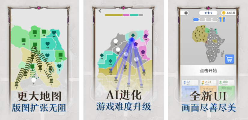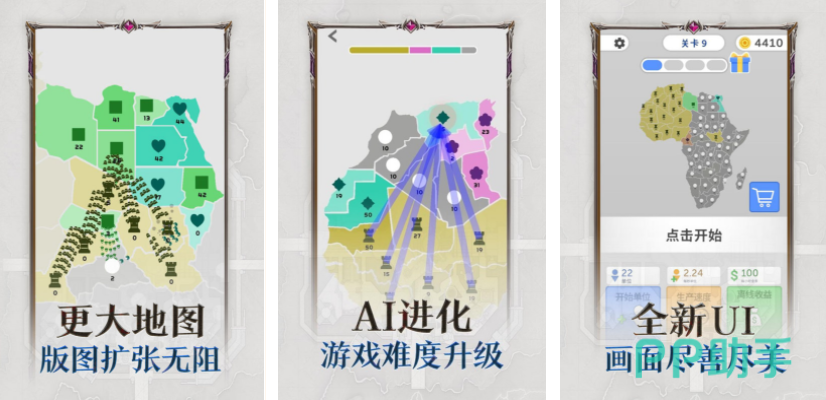 战争类型的游戏都会比较考验玩家的策略,帝国扩张主打即时对战玩法,游戏里每个成员都会拥有一块属于自己的领地,要合理操控兵力,防守领地,面对不断出现的对手,玩家要不断产出士兵,利用士兵完成对方领地的占领,每次站点完成之后,对方的领地就会成为玩家的颜色,颜色铺满所有区域之后,能成为最终的获胜者,游戏主打数值比拼,通过简单的点击操作就能完成对战。