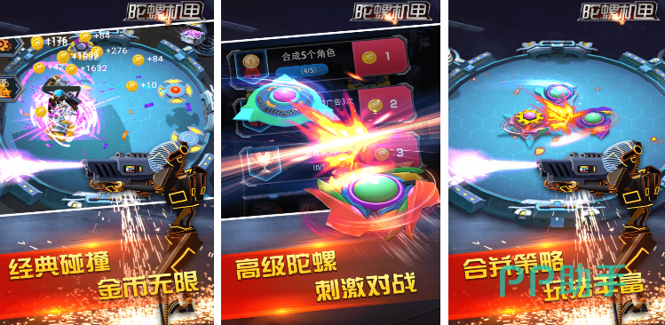该游戏突破传统单一对抗框架,支持多人同台混战。核心玩法围绕“合成进化”展开:玩家拖拽相同图鉴陀螺进行合并,每次合成提升等级,达指定阶数后自动升格为机甲形态,获得额外属性加成与碰撞增益。战斗全程自动进行,玩家专注合成策略与金币积累——金币用于购置强化部件,持续优化陀螺基础性能与特殊效果。