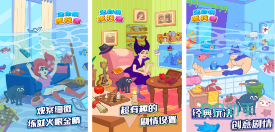 基于经典的找茬玩法为核心,极易上手的操作方式,又有特别卡通的画风所展现,在找茬的过程当中并没有任何严格的要求,大家手指滑动屏幕,就可以点击场景中的物品,并将特定的物品全部找到之后就能够轻松获胜,随着关卡的难度升级之后,这些任务的物品隐藏的也会越来越深。