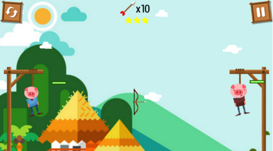 海量烧脑的谜题组合而成,所有的关卡难度也是由易到难,逐渐挑战,每个关卡中将会呈现出一只被绑架的小猪。可能会被一根绳子紧紧牵住,高高的挂起来,而大家却需要通过用手中的武器精准瞄准,并成功击中,这样就可以安全的拯救小猪仔,但是在每次发射的过程当中,必须要掌握的就是角度和力度必须要完美发射,才可以顺利完成挑战。