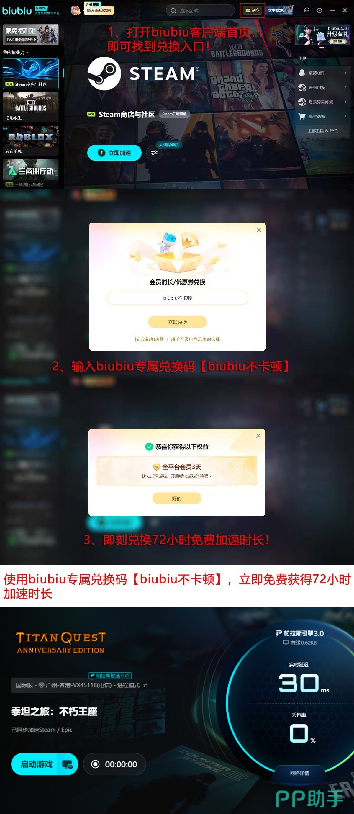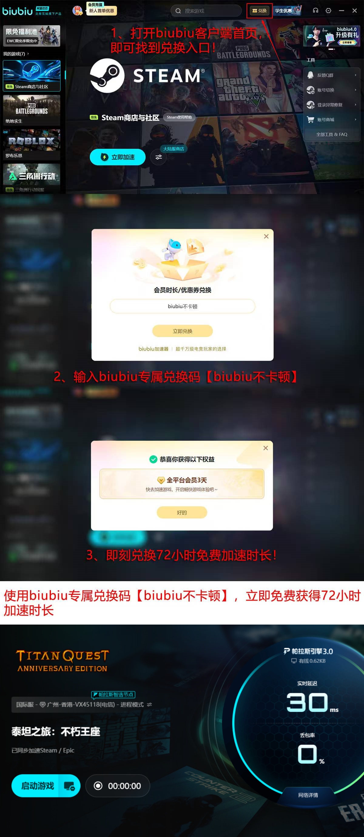目前新用户注册即可领取限时福利:首次激活即赠24小时无门槛加速服务,叠加72小时会员专属加速权益,合计4天连续可用。兑换口令为“biubiu不卡顿”,适用于《泰坦之旅》及其他多款热门游戏,便于全面测试加速效果。