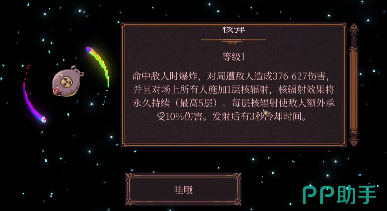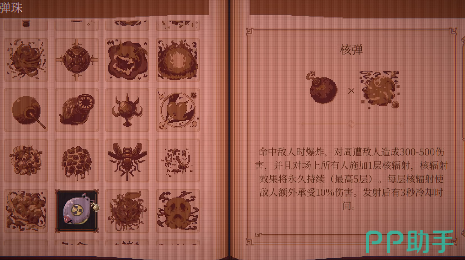 需注意,核弹存在严格使用约束:每次发射后强制进入3秒冷却期,无法连续释放。因此实战部署需精准匹配节奏节点——推荐在小怪集群密度峰值、多波敌人交汇窗口、或BOSS阶段转换瞬间释放,以最大化AOE覆盖率与辐射扩散速率。同时,其核心伤害判定依赖弹珠本体碰撞精度,落点必须精准命中敌方阵型中心区域,否则将导致范围衰减与状态触发失效。