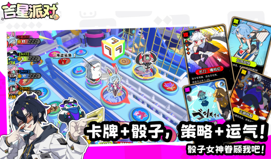 本作采用经典桌游逻辑重构的派对玩法,支持本地或在线4人同局。开局阶段玩家选定角色后,通过掷骰决定行动步数,并在棋盘式地图上触发各类事件卡牌。角色技能具备随机触发特性,配合骰子点数带来的不确定性,大幅提升每局的不可预测性与趣味性。强调即时沟通与临时策略协同,适合朋友间轻松开黑、即兴配合。