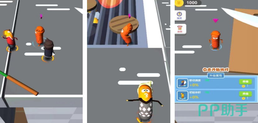 竖屏视角下的趣味生存对抗游戏,所有玩家化身Q版香肠角色,在随机生成的地图中展开搜寻与战斗。初始无武器设定,需主动拾取散落道具获取攻击手段。击败对手可获得金币资源,用于即时强化移动速度或体型体积两项核心属性,直接影响追击、闪避与碰撞压制效果。规则简明,反馈直接,非常适合碎片化时间内的多人互娱。