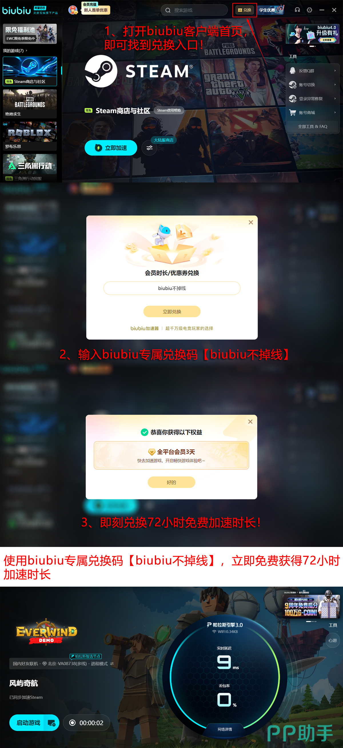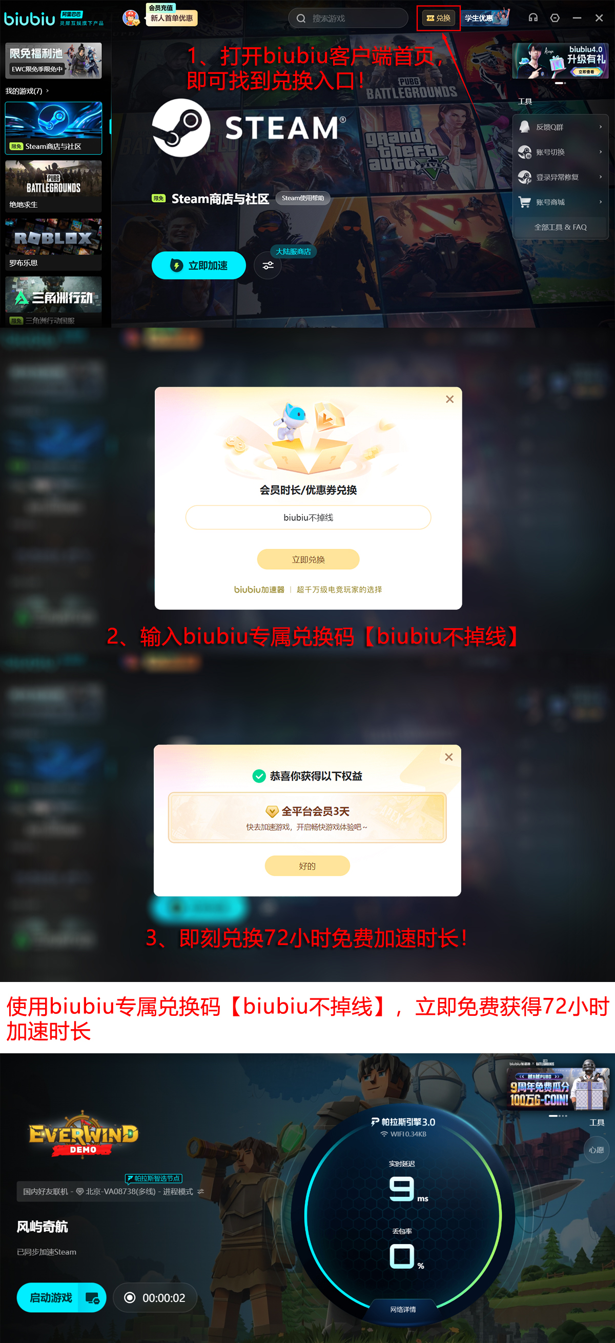 即刻注册即可无门槛体验biubiu加速器全部功能,新用户专享24小时免费试用。激活时输入【biubiu不掉线】,还可额外领取72小时加速时长。双重福利叠加,总计可享96小时高品质加速服务,全面缓解卡顿、延迟与丢包问题,畅行《风屿奇航》全域海域。