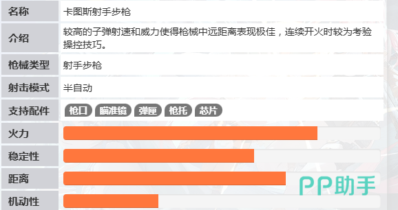卡图斯射手步枪采用半自动射击机制,单发基础伤害为62点,射速约220 RPM,结合中等后坐力增幅与可控的垂直散布,可在中远距离实现高效点射压制。实测数据显示,在300米标准靶位下,熟练玩家使用该枪进行三连发点射的命中率可达78%以上。其火力持续性与单发终结效率的平衡特性,使其成为团队推进、区域封锁及关键目标清除环节的核心支援装备。