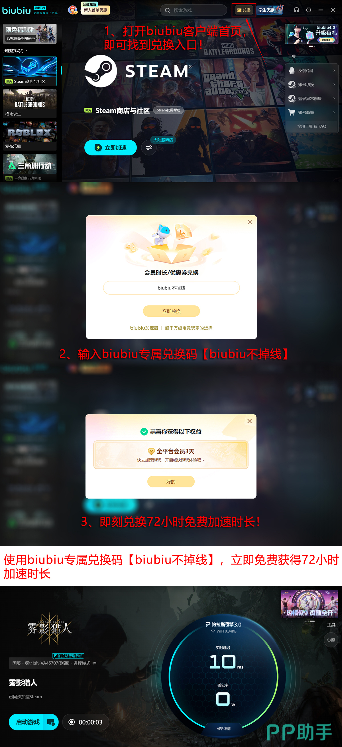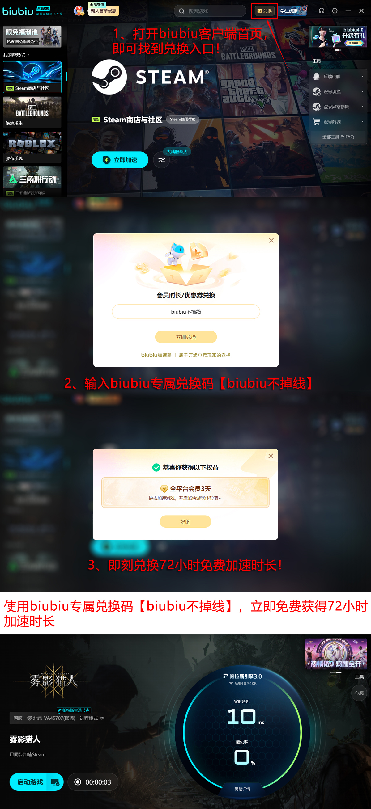 除技术实力外,biubiu加速器在用户权益设计上同样突出。新注册用户可一次性获取96小时免费加速时长——其中24小时为账号激活即赠,另72小时需通过兑换码【biubiu不掉线】领取,两项叠加生效。后续运营还将持续上线更多限时福利与长期权益,提升使用性价比。