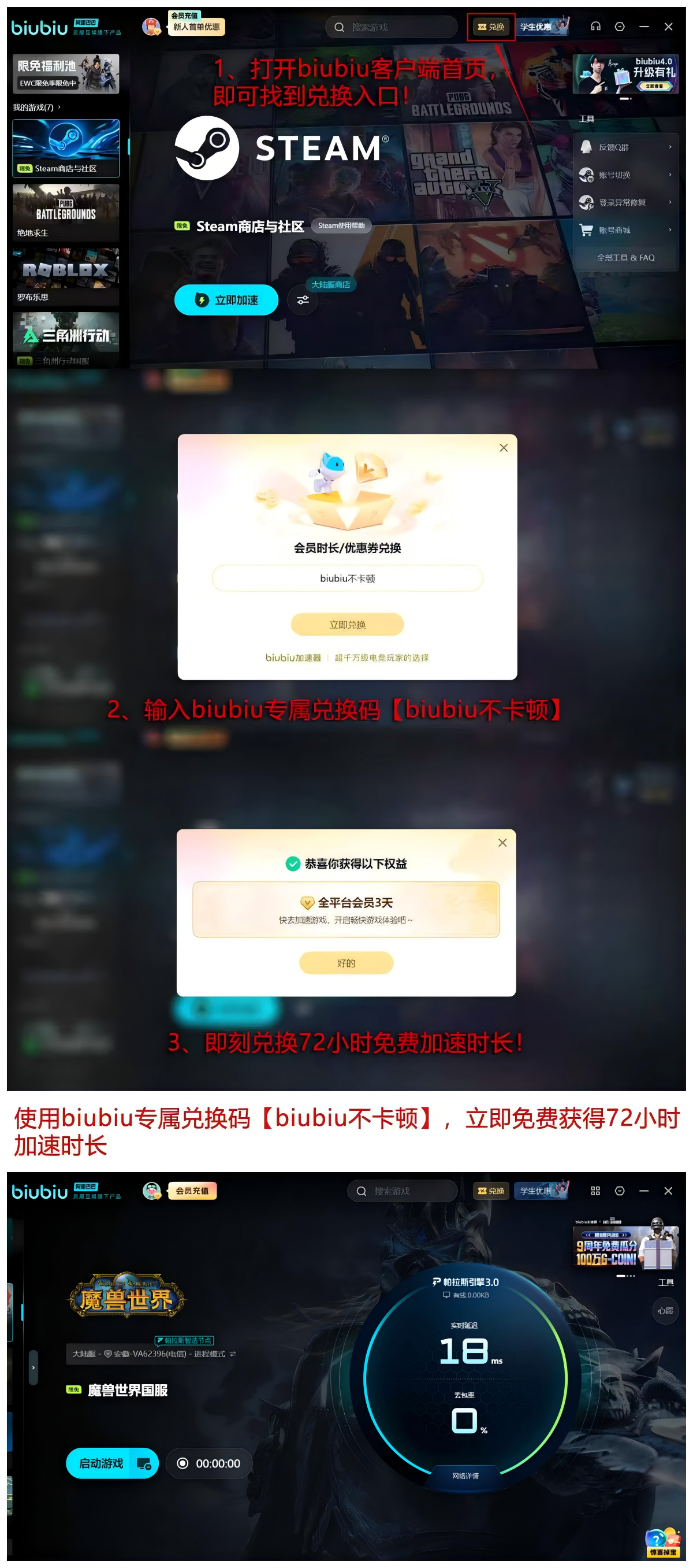 输入口令【biubiu不卡顿】,即可立即领取72小时加速时长;叠加新用户首充赠送的24小时,总计可享96小时全功能体验,便于玩家全面测试不同服务器节点下的帧率表现与操作响应速度,科学评估加速效果。