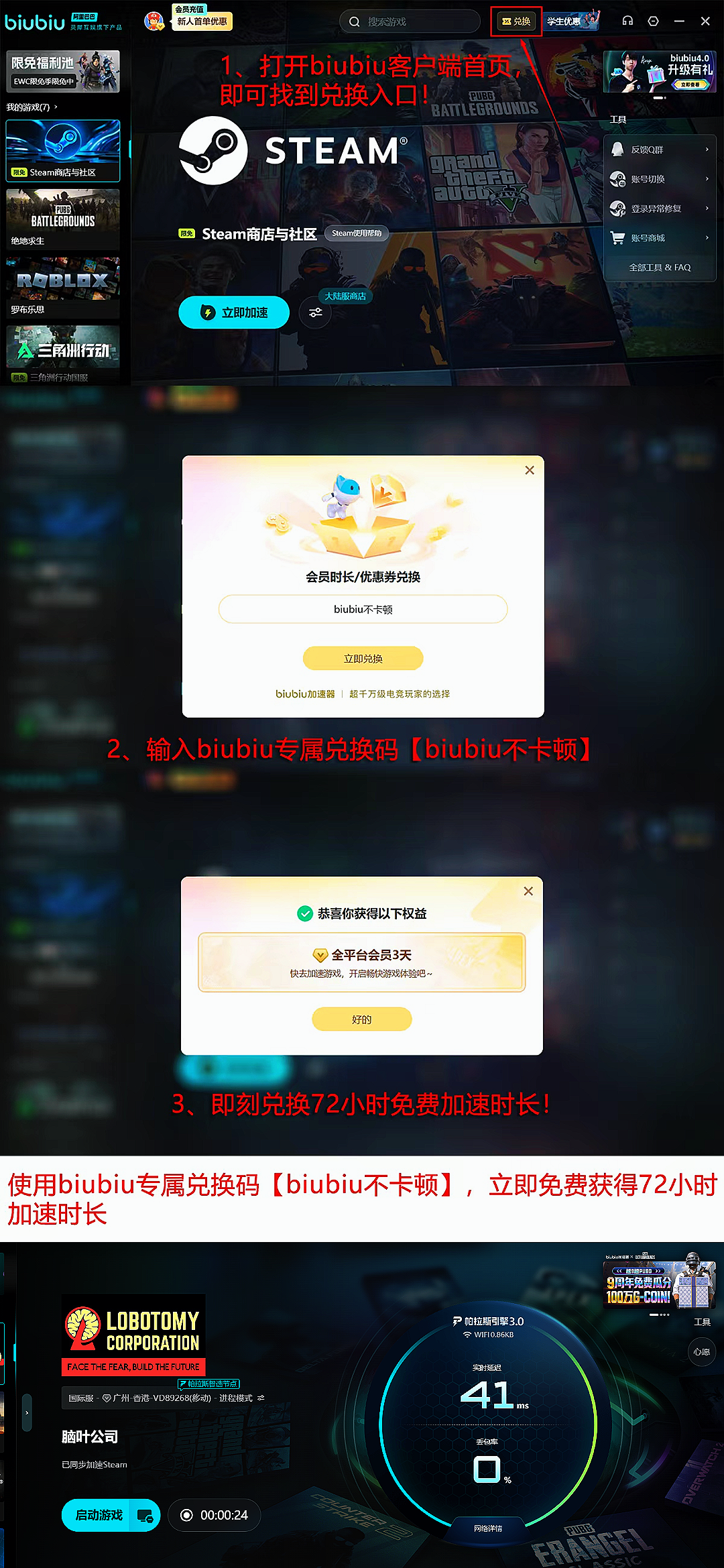 福利机制同步升级:新注册用户可立即解锁24小时全游戏免限速加速权限,零门槛体验专业级网络优化;所有账户登录后前往兑换中心,输入口令【biubiu不卡顿】,即可无条件领取3天额外加速时长,领取流程简洁,无隐藏条件。