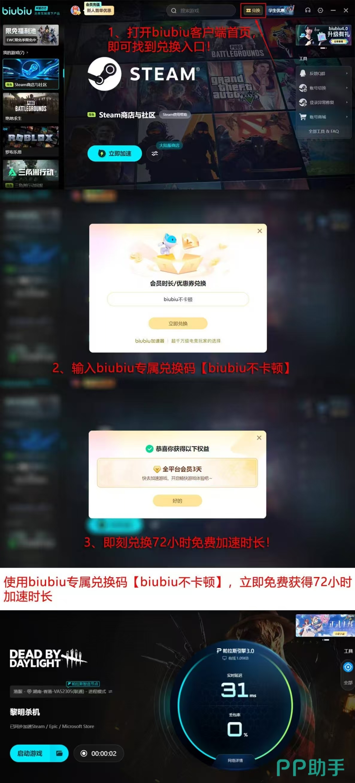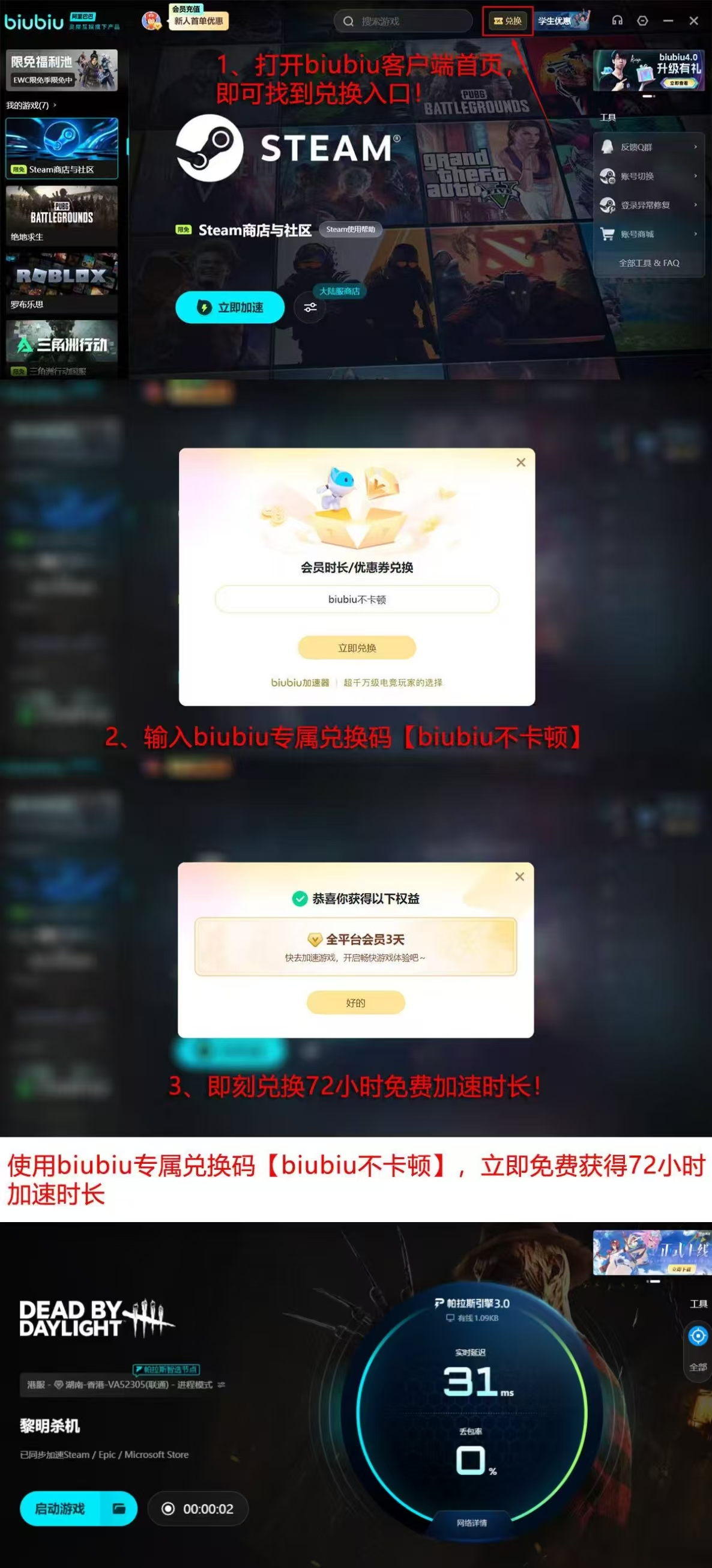 新用户注册biubiu加速器账号后,即可获得24小时全功能免费试用权限。若在注册环节输入专属兑换码【biubiu不卡顿】,还可额外延长至72小时无限制加速体验期。该权益覆盖《黎明杀机》全区域服务器,支持逃生者与监管者双视角低延迟接入,确保每位玩家在相同技术条件下展开公平对战。