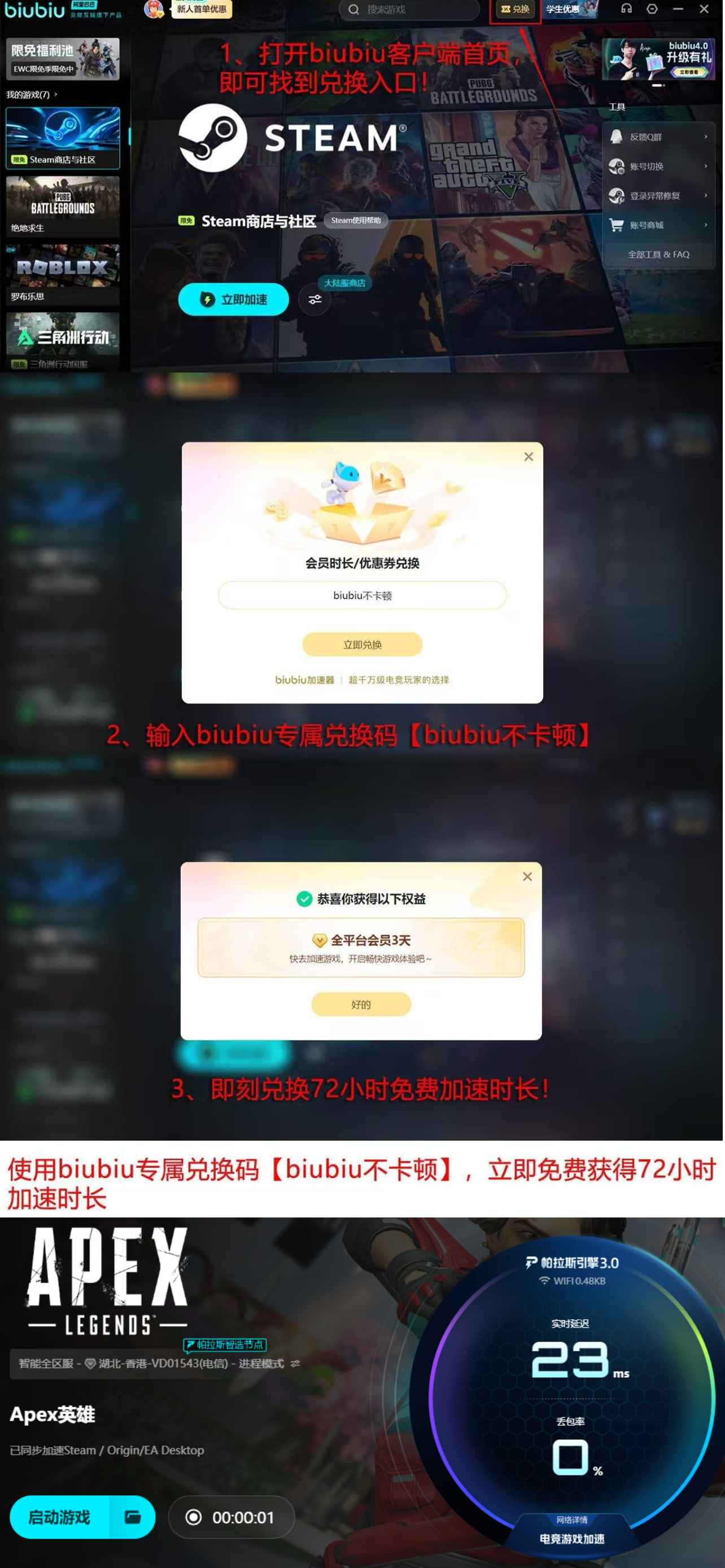 新用户完成biubiu账号注册后,可即时获取24小时全功能试用权限;输入专属激活码【biubiu不卡顿】,额外解锁72小时高级加速服务。总计96小时免费体验周期,足以覆盖完整游戏流程压力测试,包括启动加载、大厅驻留、匹配排队、实战对战等全环节,全面验证网络优化效果,杜绝卡顿、转圈、掉线等典型异常现象。