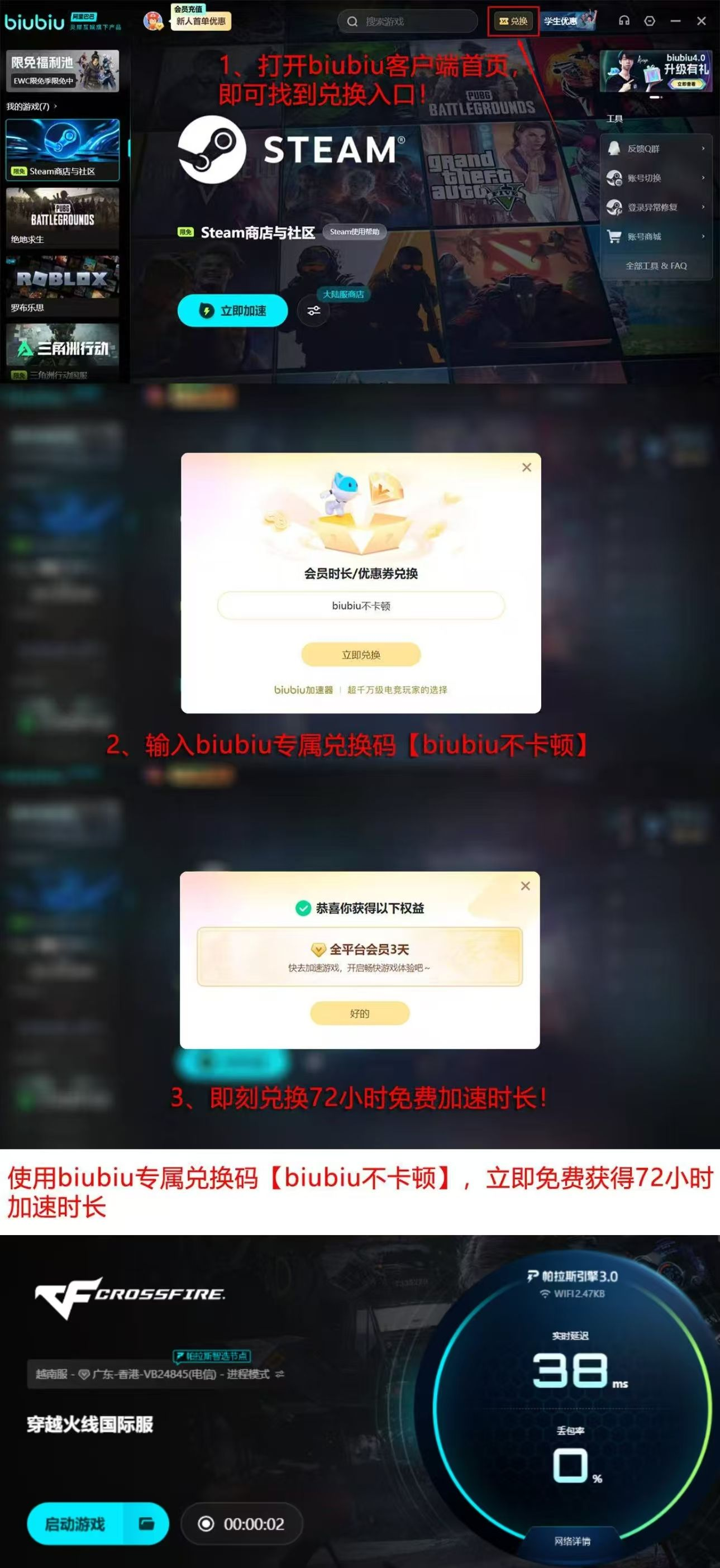 针对新用户,biubiu加速器提供无门槛体验机制:完成账号注册即可获得24小时全功能免费使用权;输入专属兑换码【biubiu不卡顿】,额外激活72小时加速服务,累计享有96小时完整体验周期。在此期间,玩家可全面观测CF游戏内帧生成稳定性、ping值波动曲线、技能释放响应时延等关键指标变化,直观感受网络层优化对战术执行精度与团队协同效率的实际提升效果。