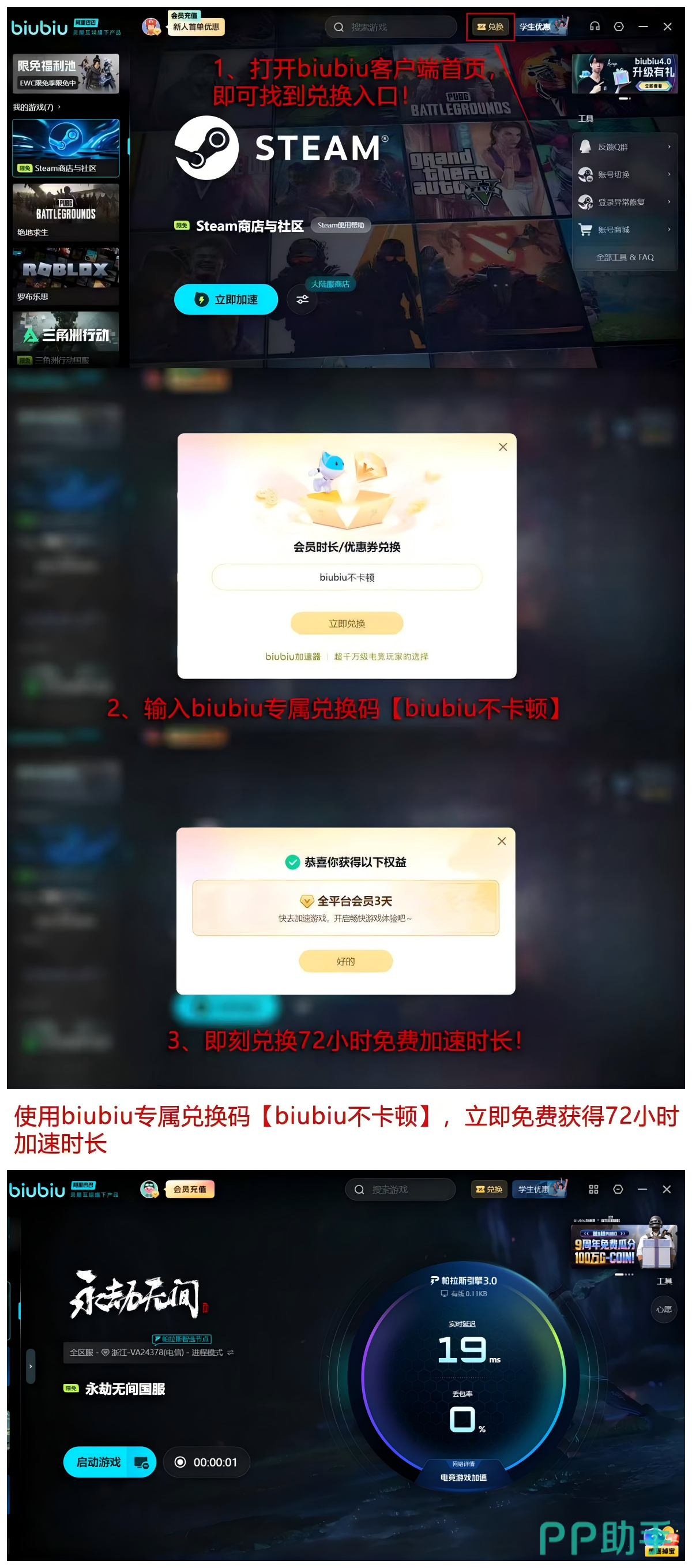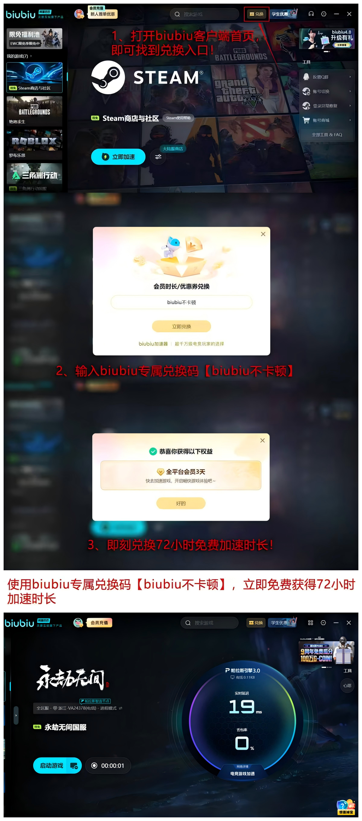 当前新用户可凭口令【biubiu不卡顿】领取72小时极速加速权益,该口令支持与新人首充福利叠加使用,最高可累计获得96小时连续加速服务。此权益覆盖全部服务器节点,无区域限制,适用于排位赛、团队对抗及活动副本等全场景。