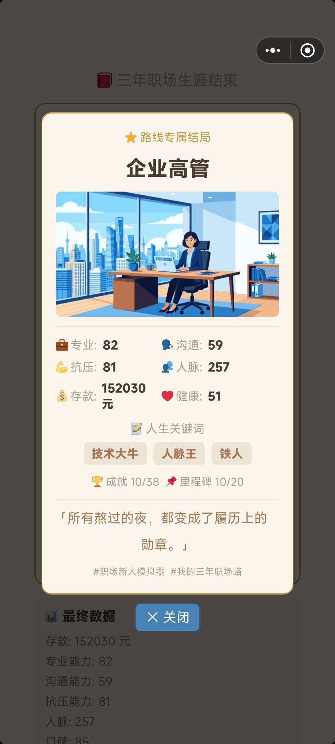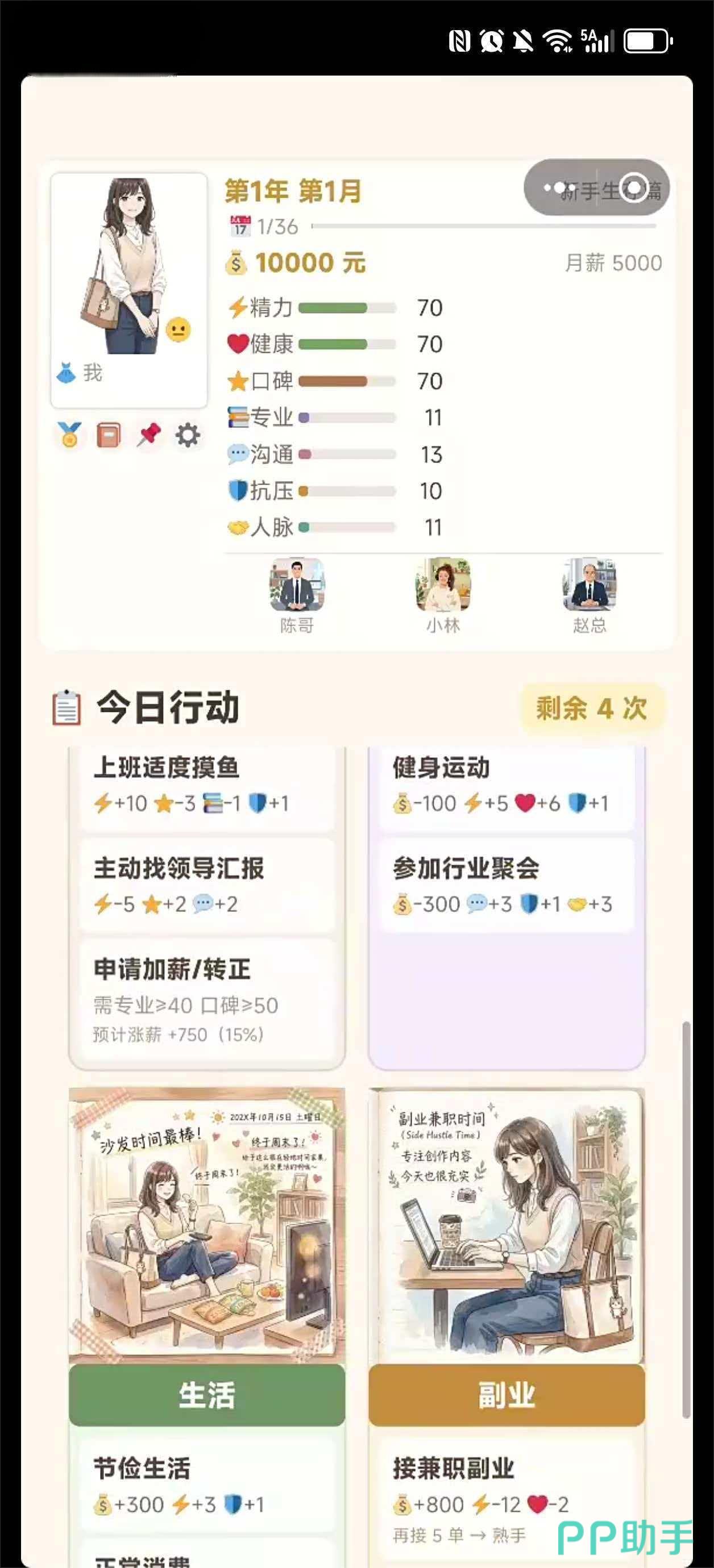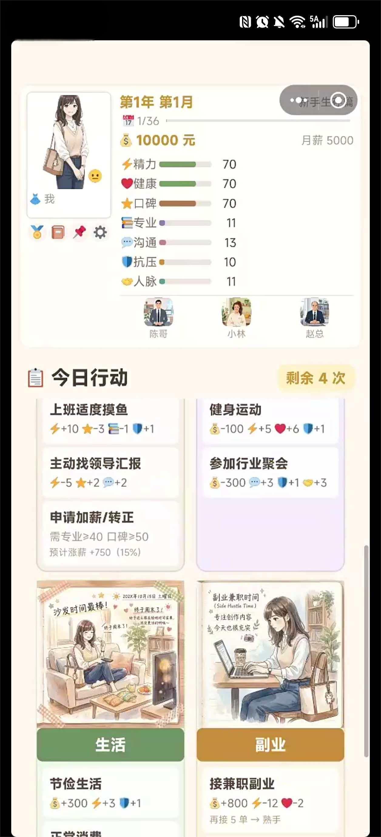 玩家需在有限资源下进行动态平衡:过度透支精力可能触发病假或离职风险;忽视技能提升将影响升职节奏;理财不当则可能导致经济危机。多线程成长机制让每条职业路径都具备独特叙事逻辑,支持自由存档回溯,便于探索不同结局分支。
