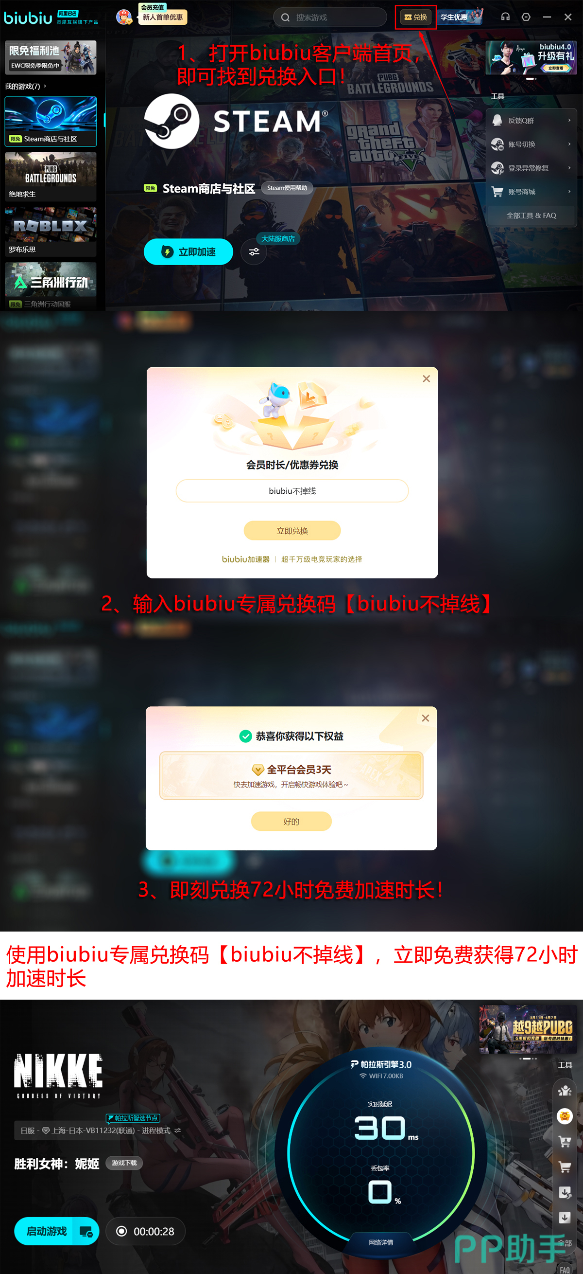 新用户注册还可叠加领取96小时免费加速时长:首次登录即赠24小时,再输入激活码【biubiu不掉线】即可额外获得72小时,总计达96小时,覆盖完整新手适应周期。