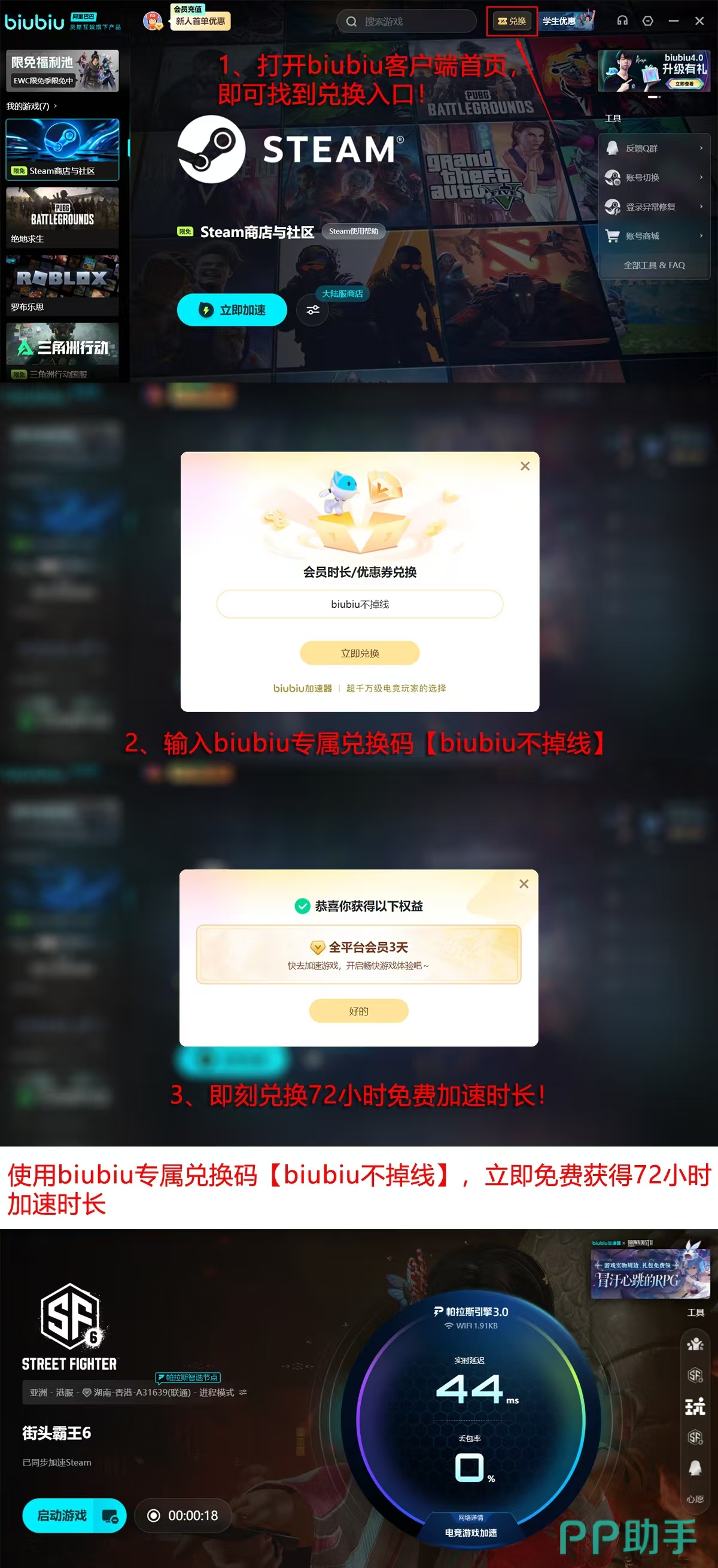 此外,新注册用户还可叠加享受96小时专属加速时长:完成首次登录即赠24小时,再输入兑换码【biubiu不掉线】即可额外领取72小时,全程零门槛、无限制,切实降低新手启动成本。