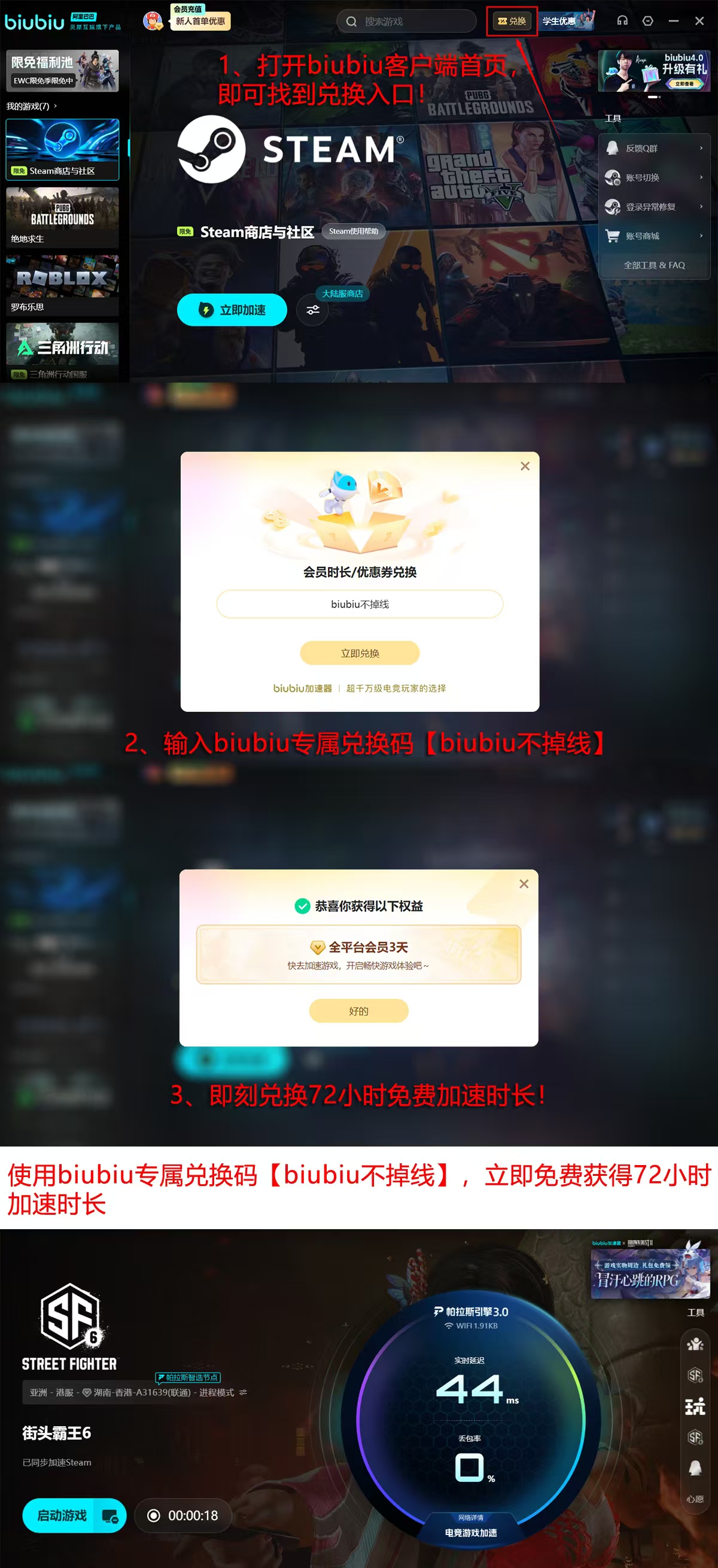 新用户注册后即可获赠24小时加速时长;再通过兑换码【biubiu不掉线】额外领取72小时,总计可享96小时免费加速体验。多重入口便捷获取、权益叠加门槛低、覆盖周期长——整体运营策略兼顾实用性与用户成长路径,切实降低玩家体验门槛。
