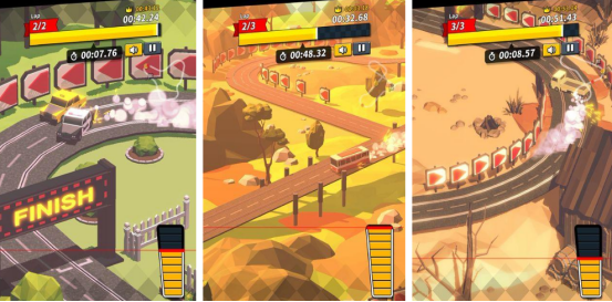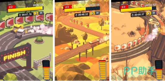 主打单指极简操控逻辑,通过滑动轨迹识别实现转向精度分级——直线段自动维持居中,弯道触发预判转向辅助。漂移系统引入G力反馈机制,侧滑角度与轮胎烟雾浓度实时联动,尾气粒子效果支持动态缩放与流速变化。关卡设计采用倒计时生存机制,基础局时长为90秒,每完成1个检查点额外增加5秒,最高叠加至180秒;共设15个主题章节,每章含3种难度梯度赛道。
