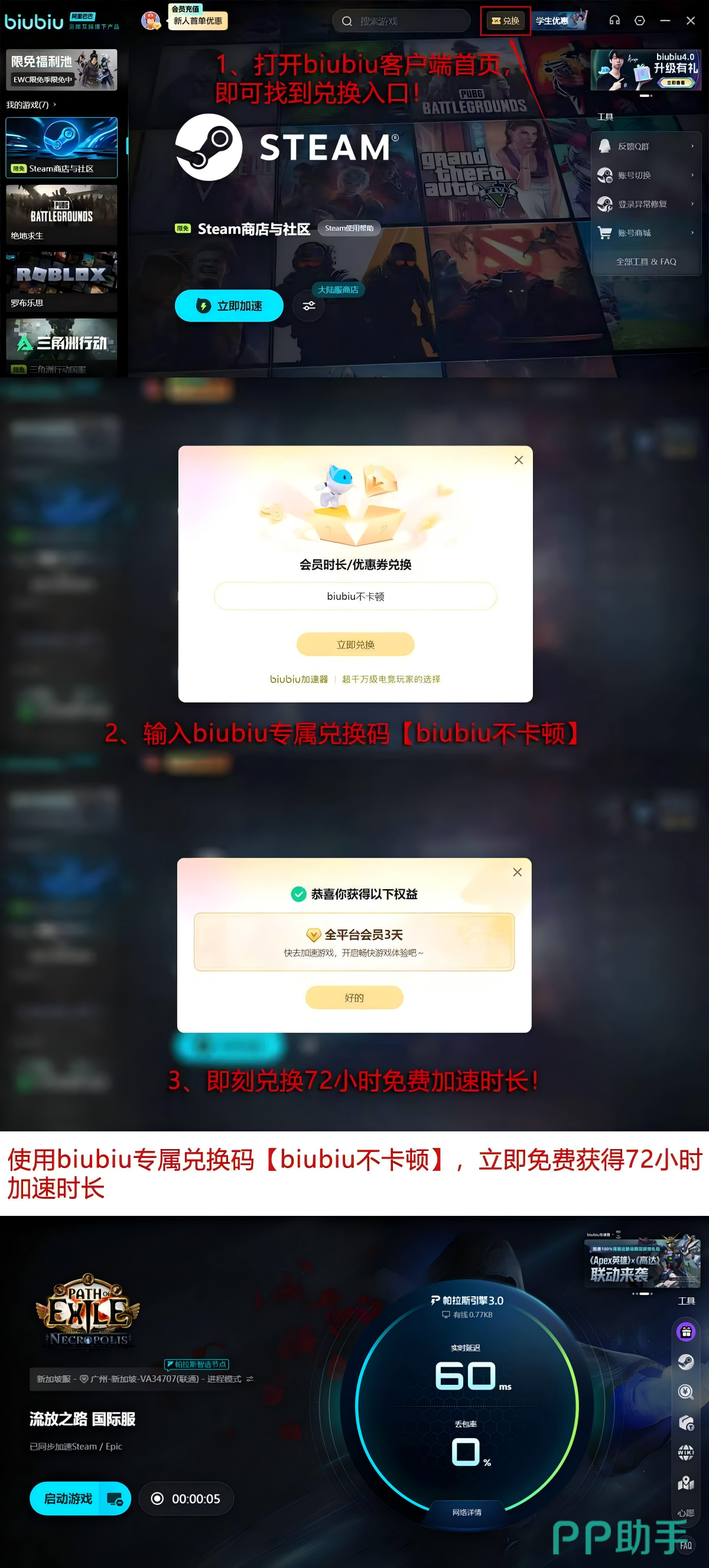 新用户注册并首次登录biubiu加速器,即可立即领取新手专属礼包,包含24小时全节点加速权益。另提供限时兑换码【biubiu不卡顿】,前往官方首页输入后可额外获得72小时服务时长。两项权益叠加,新人可连续享受96小时无中断加速体验,覆盖下载、安装、首周练级与赛季初期冲榜全流程。