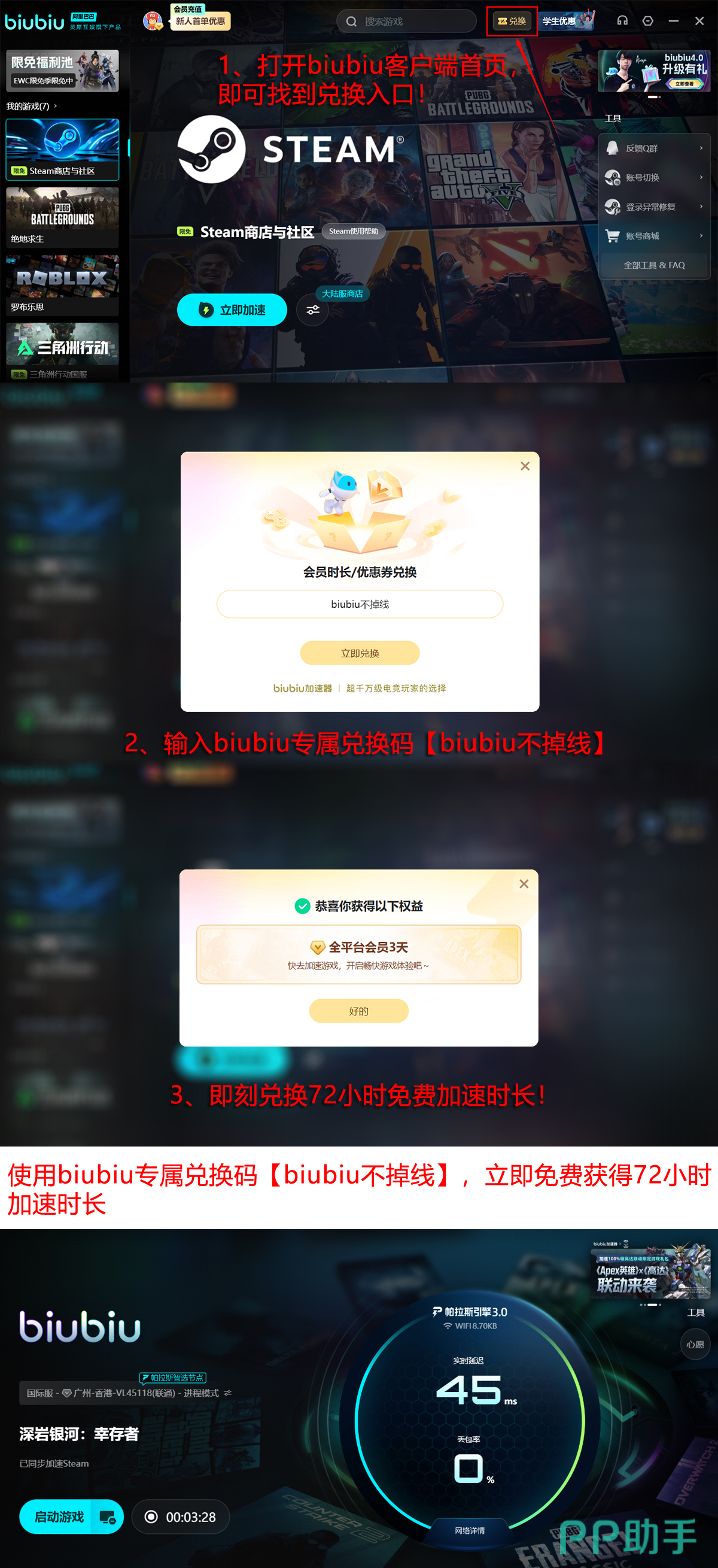 即日起,新用户完成注册即可获得24小时全功能免费试用权限;在激活界面输入兑换码【biubiu不掉线】,还可额外领取72小时加速时长。两项福利叠加后,新用户总计可享受96小时高速、低延迟的游戏网络服务。