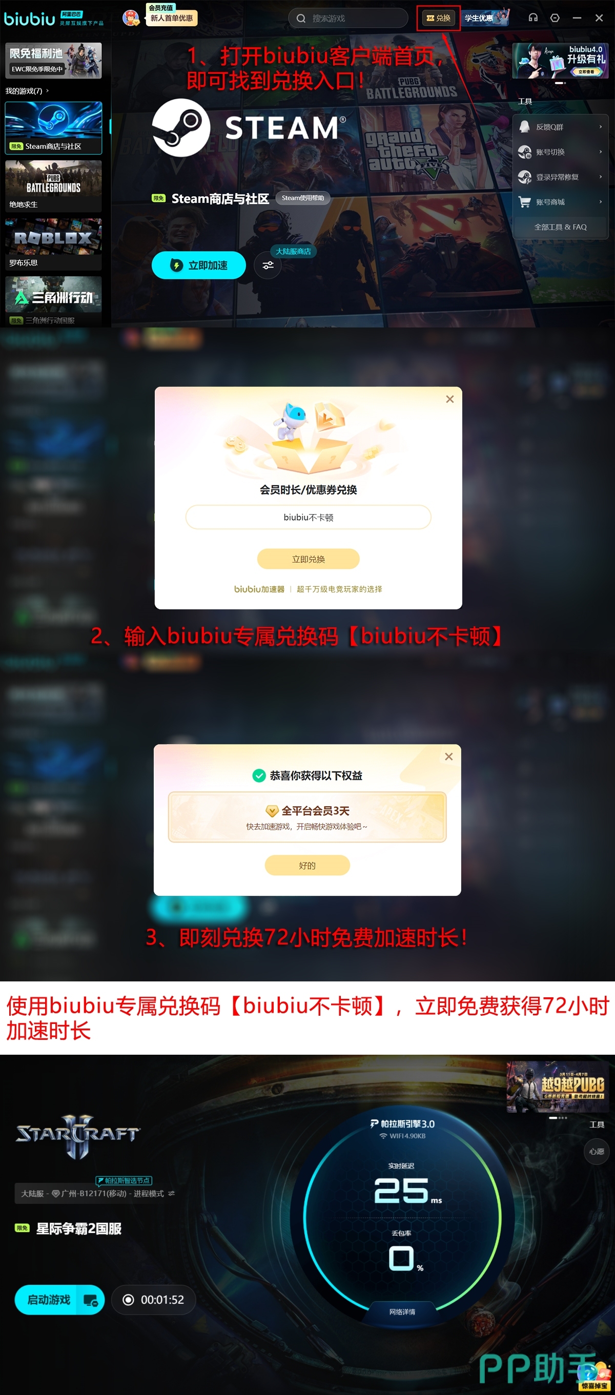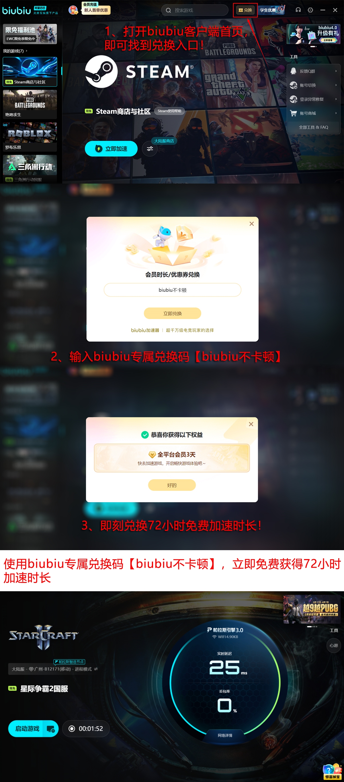 新用户注册后即可领取24小时全功能免费加速时长;所有用户输入口令【biubiu不卡顿】,还可额外激活72小时高级加速权益,覆盖天梯排位、合作任务、自定义房间等全部在线模式,支持多轮实测验证效果。