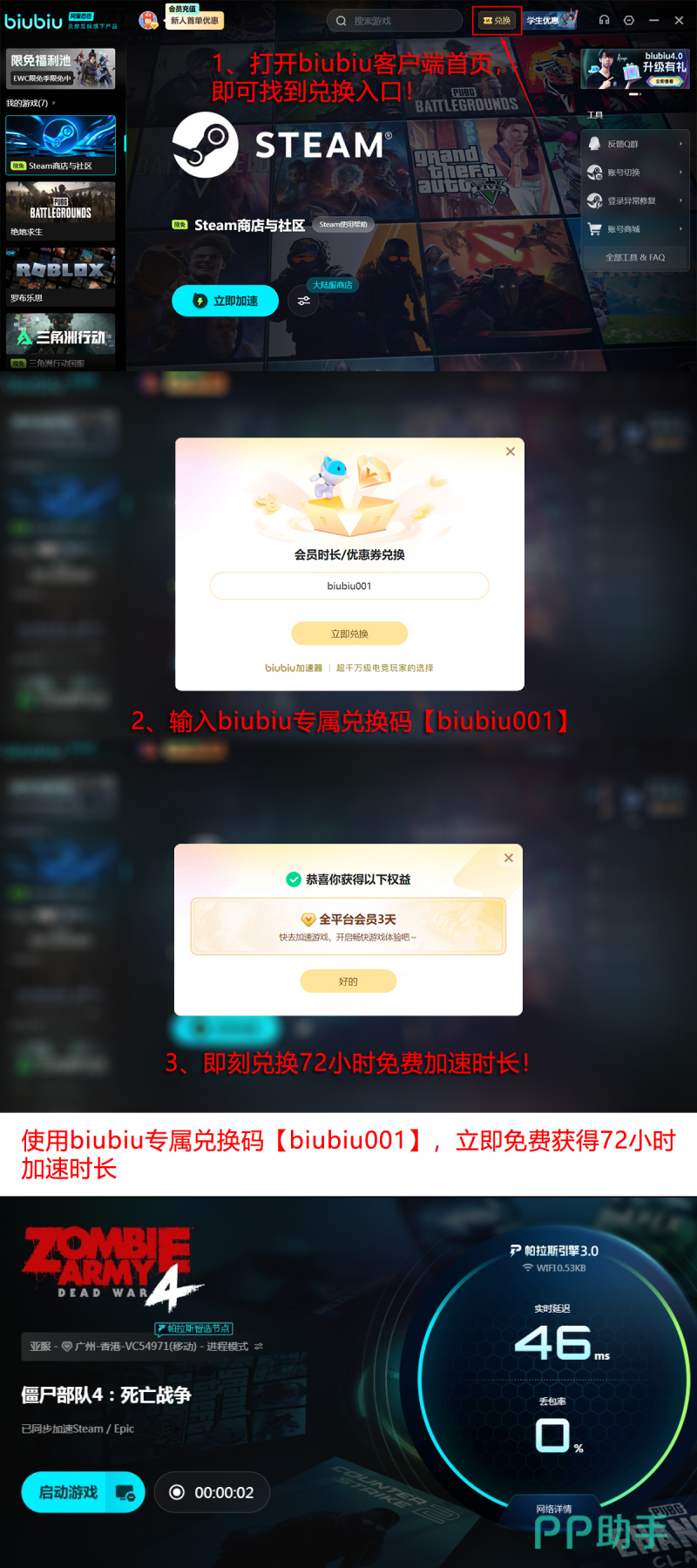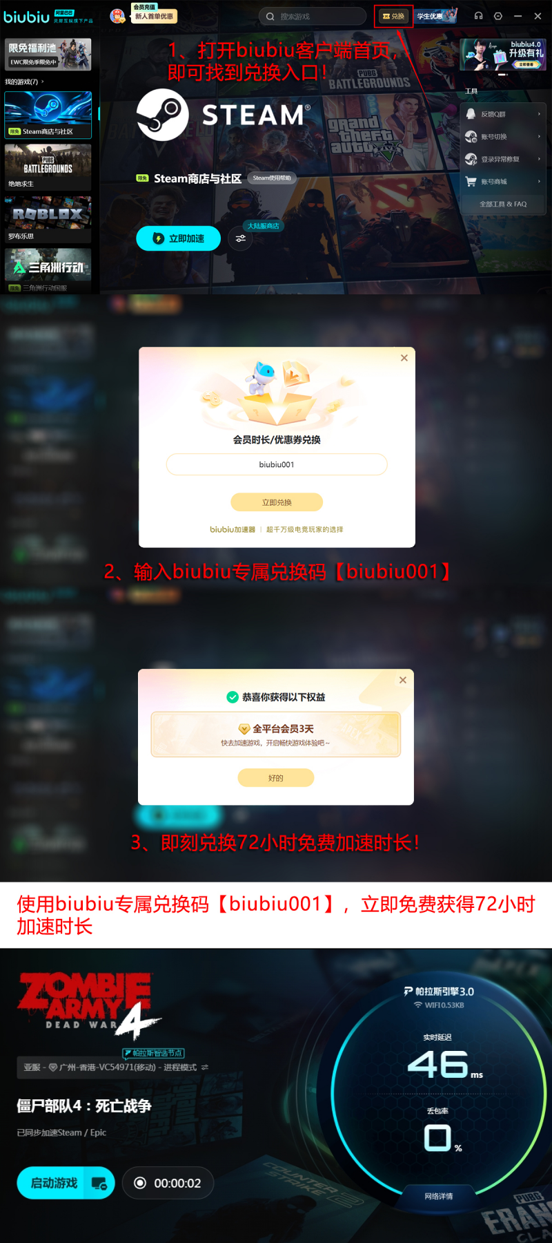 目前新用户注册即可领取96小时免费加速时长;首次登录自动发放24小时新手礼包,全程免任务、零操作门槛。如需延长使用周期,可凭专属激活码【biubiu001】额外获取3天加速权限,机会有限,建议及时领取。