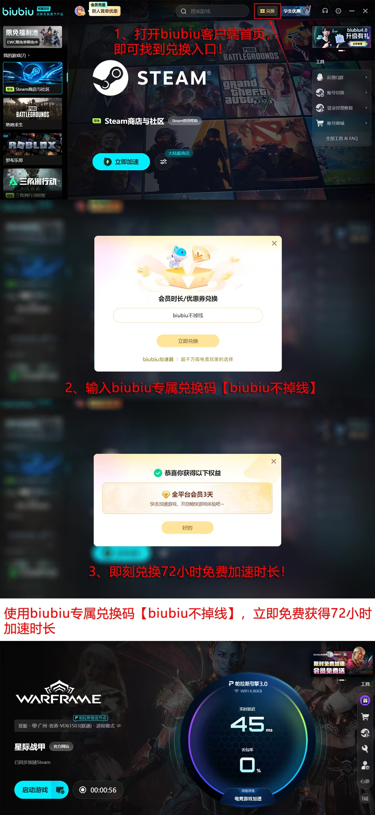 新用户专享权益同步上线:完成注册并首次登录即可获赠24小时基础加速时长;输入激活码【biubiu不掉线】还可额外解锁72小时,累计达96小时免费使用额度,足够完成完整新手引导与初期核心任务流程。