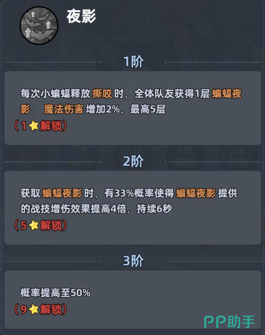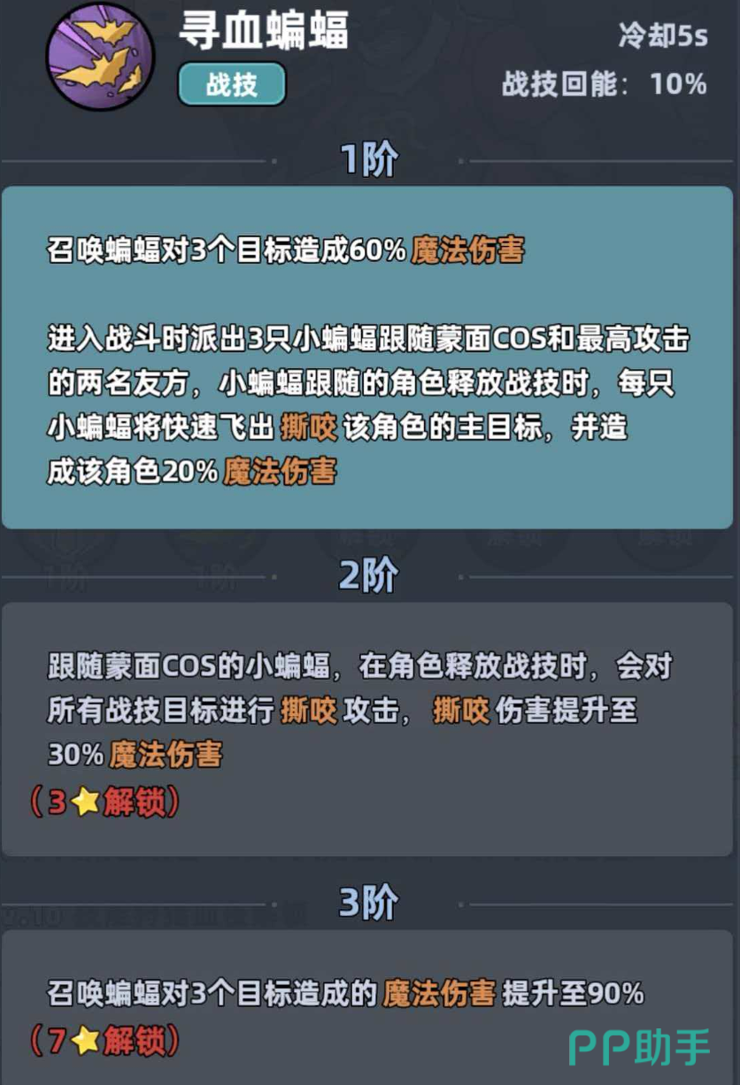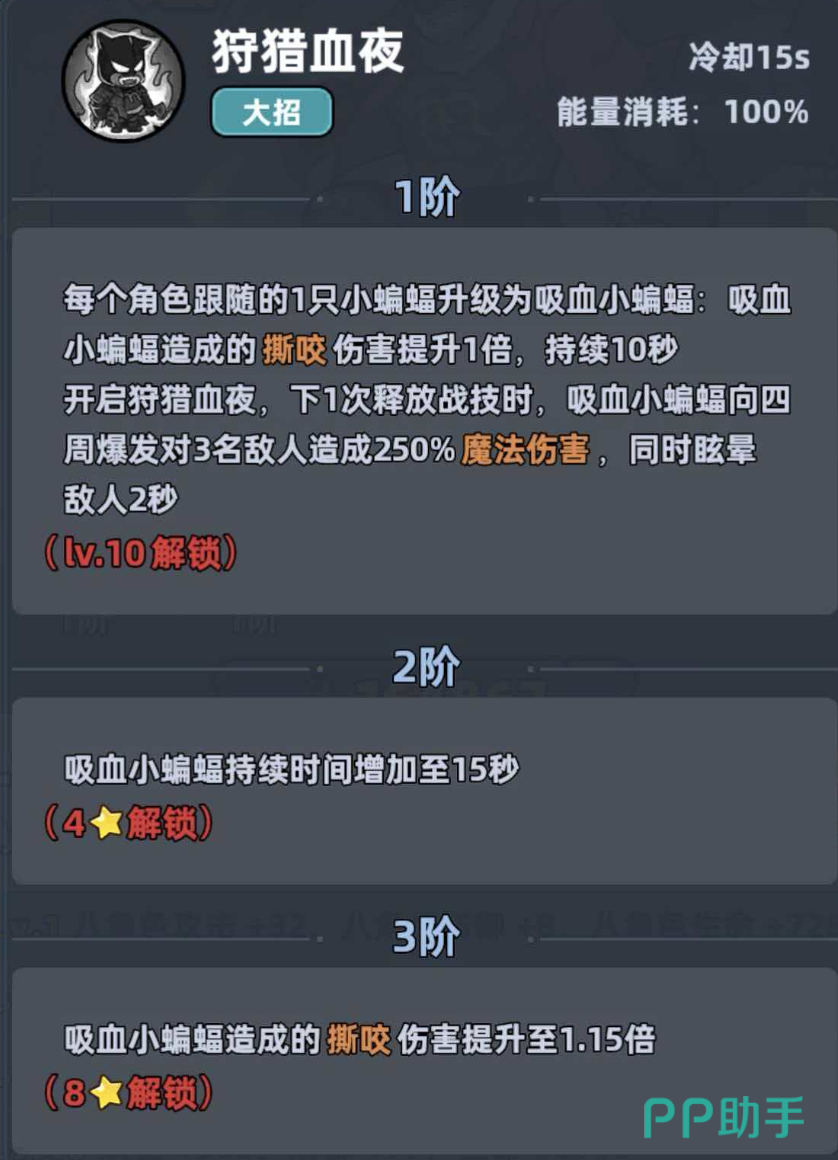 终极技能“狩猎血夜”是其核心爆发手段:释放后,所有蝙蝠获得吸血属性,攻击伤害翻倍,并在命中时触发小范围群体眩晕效果,显著干扰敌方阵型。技能升级后,蝙蝠持续时间延长、单次及总伤显著提升,进一步放大其控场与压制能力。这种兼具单体精准打击与团队节奏调控的设计逻辑,大幅提升了操作深度与阵容适配广度。