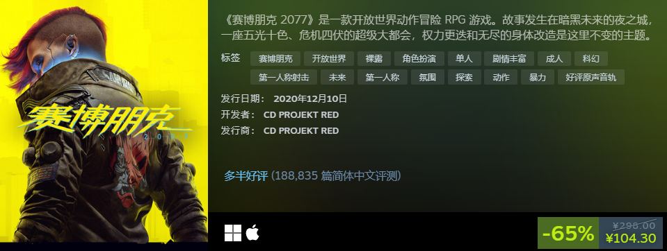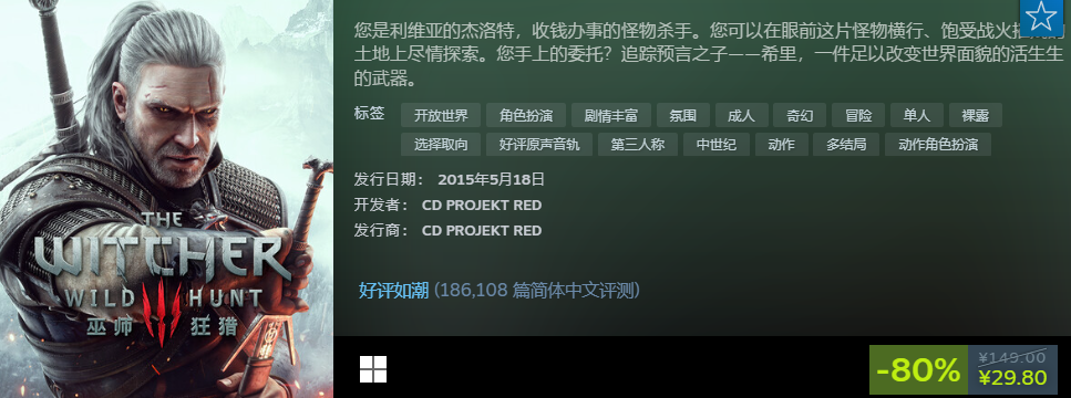 这个不用多说了,整个系列都有名,3代故事更宏大,画面也精致不少,我们扮演的杰洛特可是强大的怪物杀手,这次又要尽情探索这片大陆,收拾这些怪物们。折扣后售价超级低,29.8元就能买到了,玩到这么多内容很值得。
