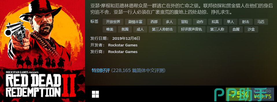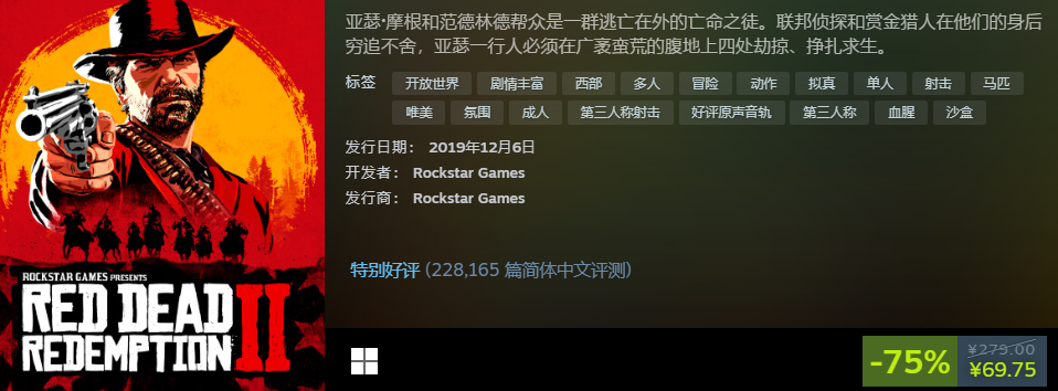 r星有多出名喜欢玩游戏的都知道,它旗下经典之一就是荒野大镖客系列了,2代出来七八年了用现在的眼光来看画面质量都不赖,加上剧情文本量庞大,有多个支线分支,买了可以玩很久的。花费69.75元就购入完整版,价格还是很低的。