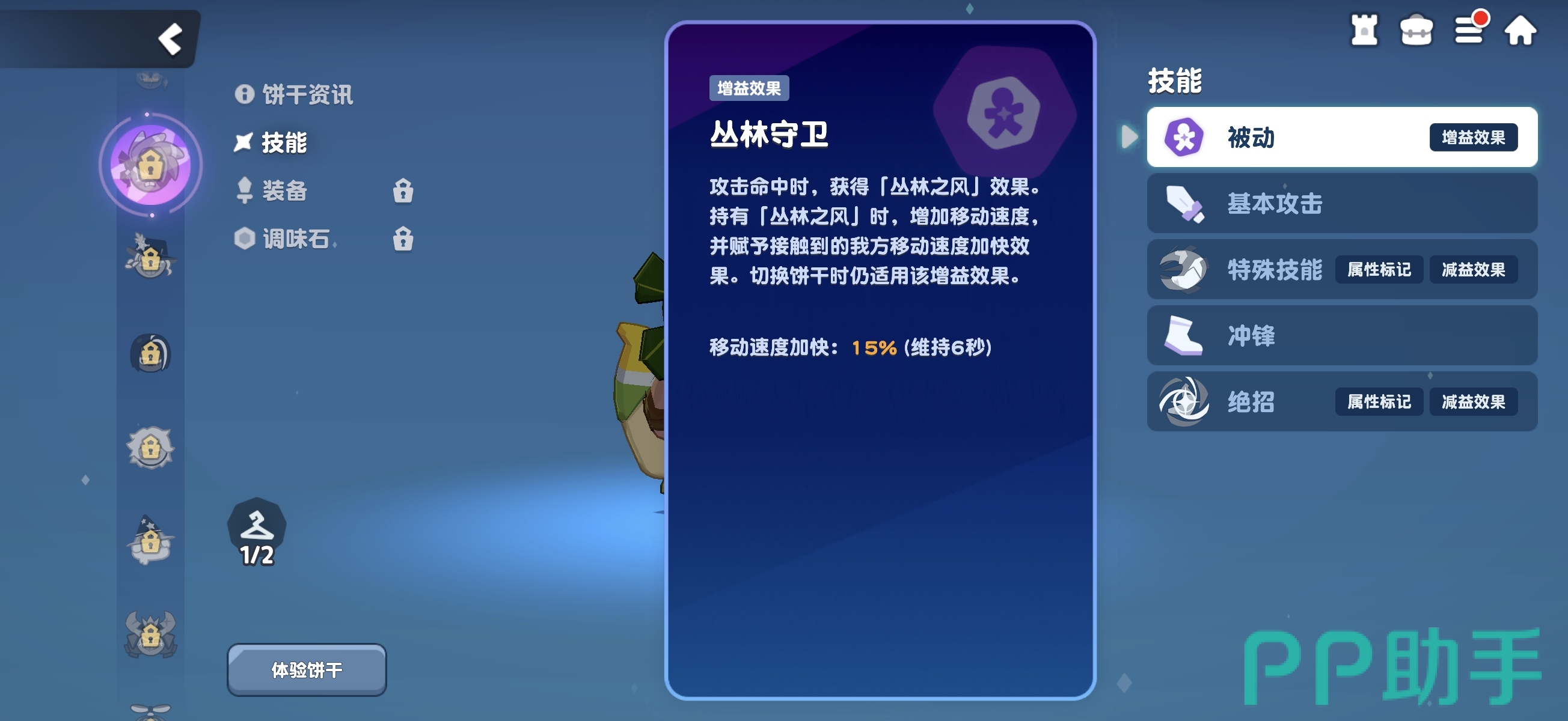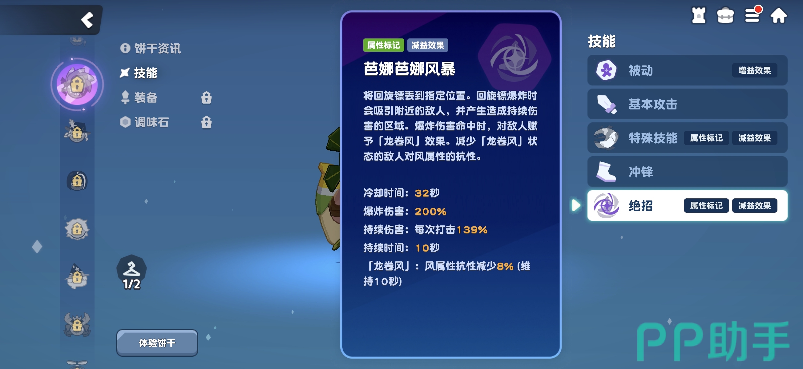大蕉饼干的被动技能“丛林之风”在每次普攻命中后叠加,可提升自身移速,并将增益扩散至路径上所有友方单位,形成群体机动性强化。基础攻击为三段式回旋镖连击,蓄力状态下伤害显著提升。主动技能“大蕉回旋镖”投掷双回旋镖,对敌方造成范围伤害并施加“龙卷风”效果——该状态使目标降低风属性抗性,属典型属性标记类机制,专为风系体系服务。终极技能则为定点引爆式控制技:回旋镖落点爆炸,牵引周围敌人并施加持续伤害,且命中时自动附加“龙卷风”效果。