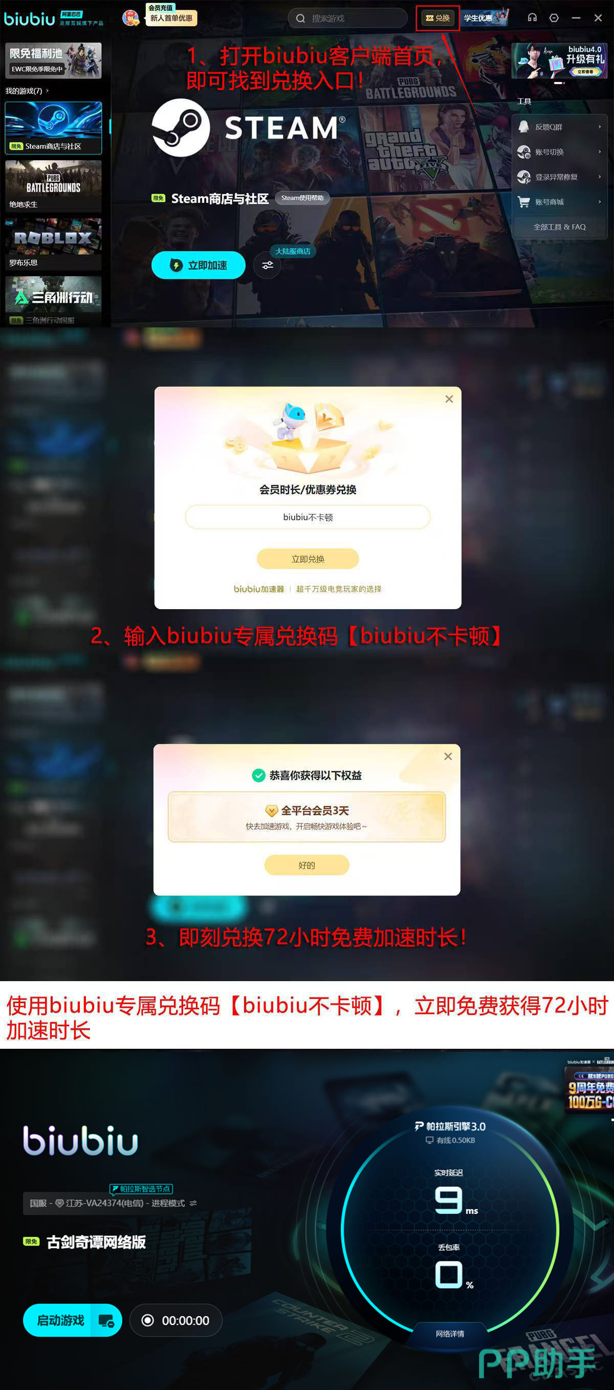 若玩家在《古剑奇谭网络版》高峰期遭遇登录缓慢、副本加载失败或剧情对话中断等问题,建议启用biubiu加速器进行定向优化。当前提供总计96小时免费试用权益:首次注册即赠24小时基础加速时长;完成登录后,前往首页“兑换”入口输入口令【biubiu不卡顿】,即可额外领取72小时高级加速服务。