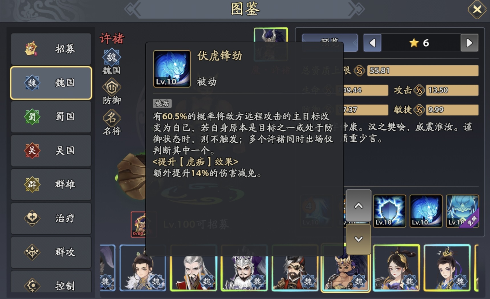 从技能构成可见,许褚并非传统意义上的纯生存型坦克。其全部技能均未提供减伤、免控、回血或护盾类生存向效果,因此抗压能力依赖基础面板与队友协同。建议搭配具备持续治疗能力的辅助型武将,例如拥有群体回血或护盾施加技能的角色,方可保障其在前排的持续站场时间。本质上,许褚属于“输出导向型前排”,在叠满三层“虎痴”后,其必杀技爆发伤害极具威慑力,适合用于关键回合定点清除高威胁目标。