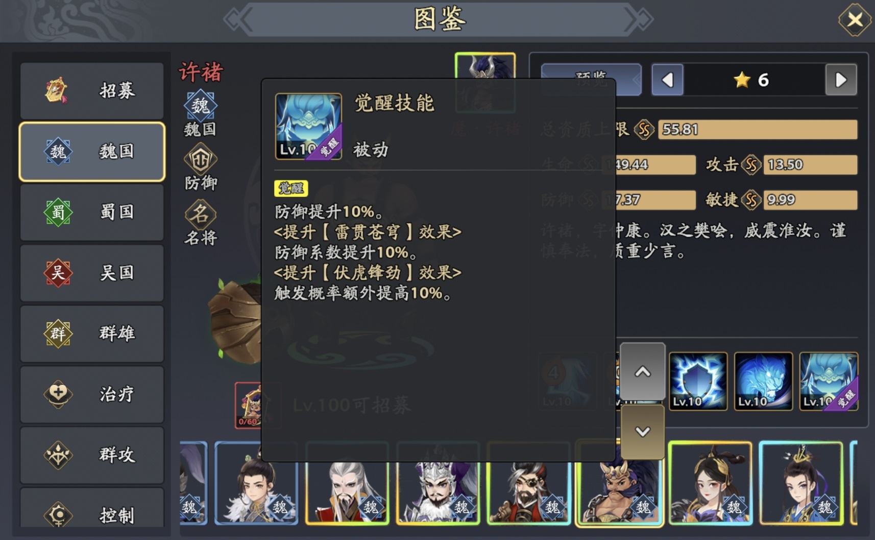 许褚在队伍中明确承担前排防御型角色,核心机制围绕“承伤—蓄势—爆发”三阶段展开。其首项被动技能为“虎痴”,每次受到伤害可叠加1层状态,最高3层,每层提升15%必杀技最终伤害;释放必杀技后层数清空,形成周期性伤害增幅循环。第二项被动具备战术干扰能力:有概率强制吸引敌方远程单位的攻击目标至自身,有效分担后排压力,但同步提升承伤总量。主动技能为单体攻击,伤害数值同时受攻击力与防御力影响,并附带降低目标攻击力的效果;另一技能则作用于敌方全体,除造成范围伤害外,还可概率驱散目标当前持有的增益状态。完成觉醒后,许褚的防御属性、防御系数、各项技能效果强度及触发概率均获得显著强化。