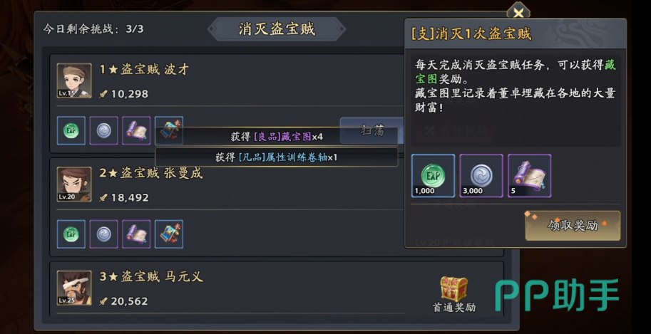以上就是三国志异闻录藏宝图怎么玩的介绍了,藏宝图这个内容相当于让玩家能简单的获得一些养成资源,要知道游戏的角色池非常深,尤其是在前期,几乎每个抽到的角色都需要玩家消耗材料要养成,所以建议玩家在初期的时候需要完成每日3次的盗贼任务。