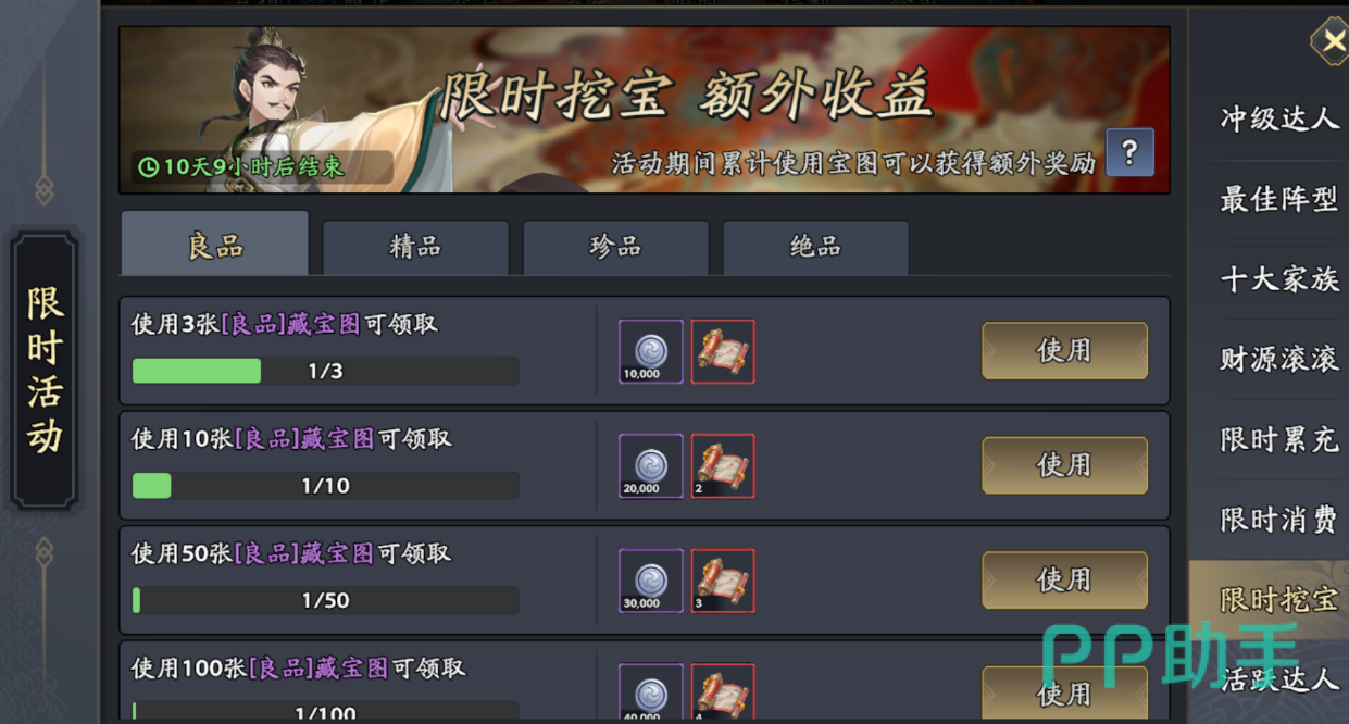 在游戏中使用藏宝图的次数还涉及到了限时活动内容,达到条件后还能获得高级藏宝图道具,所以说现在用藏宝图来抽道具还是很划算的。